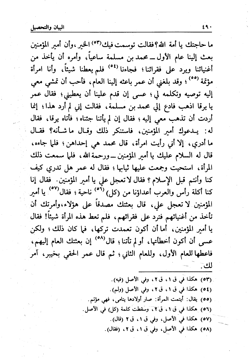 ما حاجتك يا أمة الله؟ فقالت: توسمت فيك الخير، وأن أمير المؤمنين بعث إلينا عام الأول - محمد بن مسلمة ساعيا، وأمره أن يأخذ من أغنيائنا ويرد على فقرائنا؛ فجاءنا فلم يعطنا شيئا، وأنا امرأة مؤتمة؛ وقد بلغني أن عمر باعثه إلينا العام، فأحب أن تمشي معي إليه توصيه وتكلمه لي، عسى إن قدم علينا أن يعطيني، فقال عمر: يا يرقا اذهب فادع إلي محمد بن مسلمة، فقالت: إني لم أرد هذا؛ إنما أردت أن تذهب معي إليه، فقال: إن لم يأتنا جئناه؛ فأتاه يرقا، فقال له: يدعوك أمير المؤمنين، فاستنكر ذلك وقال: ما شأنه؟ فقال: ما أدري، إلا أني رأيت امرأة، قال محمد: هي إحداهن؛ فلما جاءه، قال له: السلام عليك يا أمير المؤمنين - ورحمة الله، فلما سمعت ذلك المرأة، استحيت وجمعت عليها ثيابها؛ فقال له عمر: هل تدري كيف كنا وأنتم قبل الإسلام؟ فقال: لا تعجل علي يا أمير المؤمنين، فقال: إنا كنا أكلة رأس والعرب أعداؤنا من (كل) ناحية، فقال: يا أمير المؤمنين لا تعجل علي، قال: بعثتك مصدقا على هؤلاء، وأمرتك أن تأخذ من أغنيائهم، فترد على فقرائهم، فلم تعط هذه المرأة شيئا، فقال: يا أمير المؤمنين، أما أن أكون تعمدت تركها، فما كان ذلك؛ ولكن عسى أن أكون أخطأتها، أو لم تأتنا، قال: إن بعثتك العام إليهم، فأعطها للعام الأول، وللعام الثاني، ثم قال عمر: الحقي بخيبر، آمر لك.