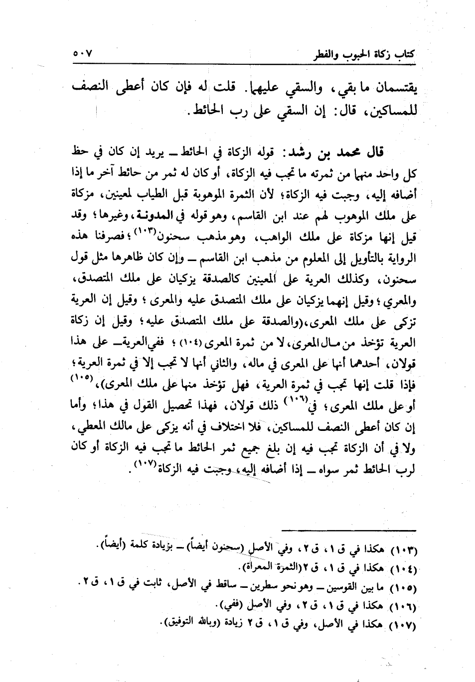 قال محمد بن رشد: قوله الزكاة في الحائط - يريد إن كان في حظ كل واحد منهما من ثمرته ما تجب فيه الزكاة، أو كان له ثمر من حائط آخر ما إذا أضافه إليه، وجبت فيه الزكاة؛ لأن الثمرة الموهوبة قبل الطياب لمعينين، مزكاة على ملك الموهوب لهم عند ابن القاسم، وهو قوله في المدونة، وغيرها؛ وقد قيل: إنها مزكاة على ملك الواهب، وهو مذهب سحنون؛ فصرفنا هذه الرواية بالتأويل إلى المعلوم من مذهب ابن القاسم - وإن كان ظاهرها مثل قول سحنون، وكذلك العرية على المعينين كالصدقة يزكيان على ملك المتصدق، والمعري؛ وقيل: إنهما يزكيان على ملك المتصدق عليه والمعرَى؛ وقيل: إن العرية تزكى على ملك المعرَى، (والصدقة على ملك المتصدق عليه؛ وقيل: إن زكاة العرية تؤخذ من مال المعرى، لا من ثمرة المعرى؛ ففي العرية - على هذا قولان؛ أحدهما: أنها على المعرى في ماله، والثاني: أنها لا تجب إلا في ثمرة العرية؛ فإذا قلت: إنها تجب في ثمرة العرية، فهل تؤخذ منها على ملك المعرى) أو على ملك المعري؛ في ذلك قولان، فهذا تحصيل القول في هذا، وأما إن كان أعطى النصف للمساكين، فلا اختلاف في أنه يزكى على مالك المعطي، ولا في أن الزكاة تجب فيه إن بلغ جميع ثمر الحائط ما تجب فيه الزكاة أو كان لرب الحائط ثمر سواه - إذا أضافه إليه، وجبت فيه الزكاة.