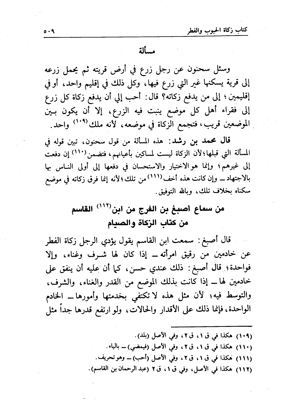 من سماع أصبغ بن الفرج من ابن القاسم من كتاب الزكاة والصيام قال أصبغ: سمعت ابن القاسم يقول: يؤدي الرجل زكاة الفطر عن خادمين من رقيق امرأته - إذا كان لها شرف وغناء، وإلا فواحدة.