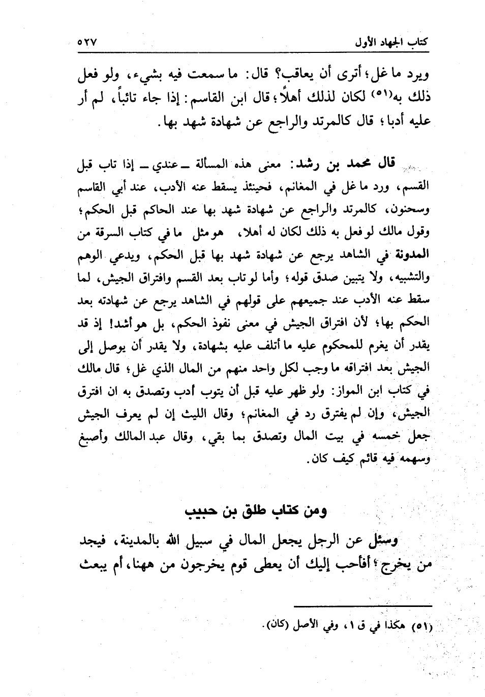 قال محمد بن رشد: معنى هذه المسألة- عندي- إذا تاب قبل القسم، ورد ما غل في المغانم، فحينئذ يسقط عنه الأدب، عند ابن القاسم وسحنون، كالمرتد والراجع عن شهادة شهد بها عند الحاكم قبل الحكم؛ وقول مالك لو فعل به ذلك لكان له أهلا، هو مثل ما في كتاب السرقة من المدونة في الشاهد يرجع عن شهادة شهد بها قبل الحكم، ويدعي الوهم والتشبيه، ولا يتبين صدق قوله؛ وأما لو تاب بعد القسم وافتراق الجيش، لما سقط عنه الأدب عند جميعهم على قولهم في الشاهد يرجع عن شهادته بعد الحكم بها؛ لأن افتراق الجيش مي معنى نفوذ الحكم، بل هو أشد! إذ قد يقدر أن يغرم للمحكوم عليه ما أتلف عليه بشهادة، ولا يقدر أن يوصل إلى الجيش بعد افتراقه ما وجب لكل واحد منهم من المال الذي غل؛ قال مالك في كتاب ابن المواز: ولو ظهر عليه قبل أن يتوب أدب وتصدق به إن افترق الجيش، وإن لم يفترق رد في المغانم؛ وقال الليث إن لم يعرف الجيش جعل خمسه في بيت المال وتصدق بما بقي، وقال عبد المالك وأصبغ وسهمه فيه قائم كيف كان.