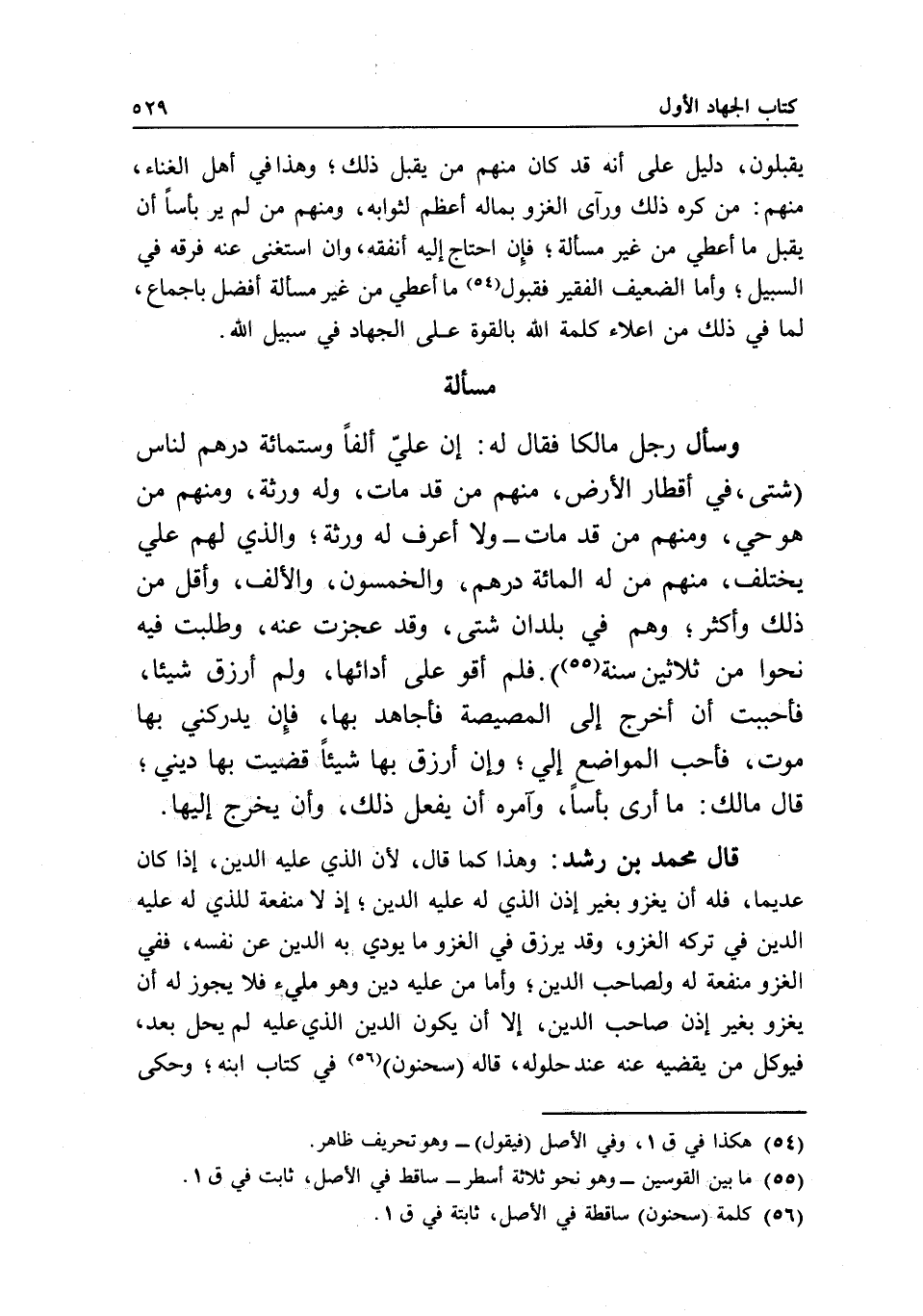 مسألة وسأل رجل مالكا فقال له: إن علي ألفا وستمائة درهم لناس (شتى، في أقطار الأرض، منهم من قد مات، وله ورثة، ومنهم من هو حي، ومنهم من قد مات - ولا أعرف له ورثة؛ والذي لهم علي يختلف، منهم من له المائة درهم، والخمسون، والألف، وأقل من ذلك وأكثر؛ وهم في بلدان شتى، وقد عجزت عنه، وطلبت فيه نحوا من ثلاثين سنة) . فلم أقو على أدائها، ولم أرزق شيئا، فأحببت أن أخرج إلى المصيصة فأجاهد بها، فإن يدركني بها موت، فأحب المواضع إلي؛ وإن أرزق بها شيئا قضيت بها ديني؟ قال مالك: ما أرى بأسا، وأمره أن يفعل ذلك، وأن يخرج إليها.