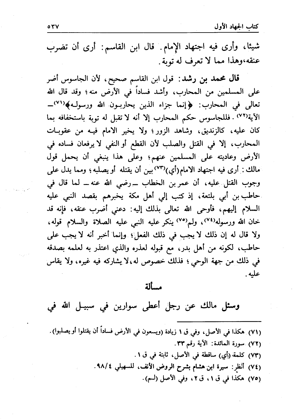 قال محمد بن رشد: قول ابن القاسم صحيح؛ لأن الجاسوس أضر على المسلمين من المحارب، وأشد فسادا في الأرض منه؛ وقد قال الله تعالى في المحارب: {إِنَّمَا جَزَاءُ الَّذِينَ يُحَارِبُونَ اللَّهَ وَرَسُولَهُ} [المائدة: 33]- الآية. فللجاسوس حكم المحارب إلا أنه لا تقبل له توبة باستخفافه بما كان عليه، كالزنديق، وشاهد الزور؛ ولا يخير الإمام فيه من عقوبات المحارب، إلا في القتل والصلب لأن القطع أو النفي لا يرفعان فساده في الأرض وعاديته على المسلمين عنهم؛ وعلى هذا ينبغي أن يحمل قول مالك: أرى فيه اجتهاد الإمام (أي) بين أن يقتله أو يصلبه؛ ومما يدل على وجوب القتل عليه، أن عمر بن الخطاب - رَضِيَ اللَّهُ عَنْهُ - لما قال في حاطب بن أبي بلتعة، إذ كتب إلي أهل مكة يخبرهم بقصد النبي - عَلَيْهِ السَّلَامُ - إليهم، فأوحى الله تعالى بذلك إليه: دعني أضرب عنقه، فإنه قد خان الله ورسوله، ولم ينكر عليه النبي - عَلَيْهِ الصَّلَاةُ وَالسَّلَامُ - قوله، ولا قال له إن ذلك لا يجب في ذلك الفعل؛ وإنما أخبر أنه لا يجب على حاطب، لكونه من أهل بدر، مع قبوله لعذره والذي اعتذر به لعلمه بصدقه في ذلك من جهة الوحي؛ فذلك خصوص له، لا يشاركه فيه غيره، ولا يقاس عليه.