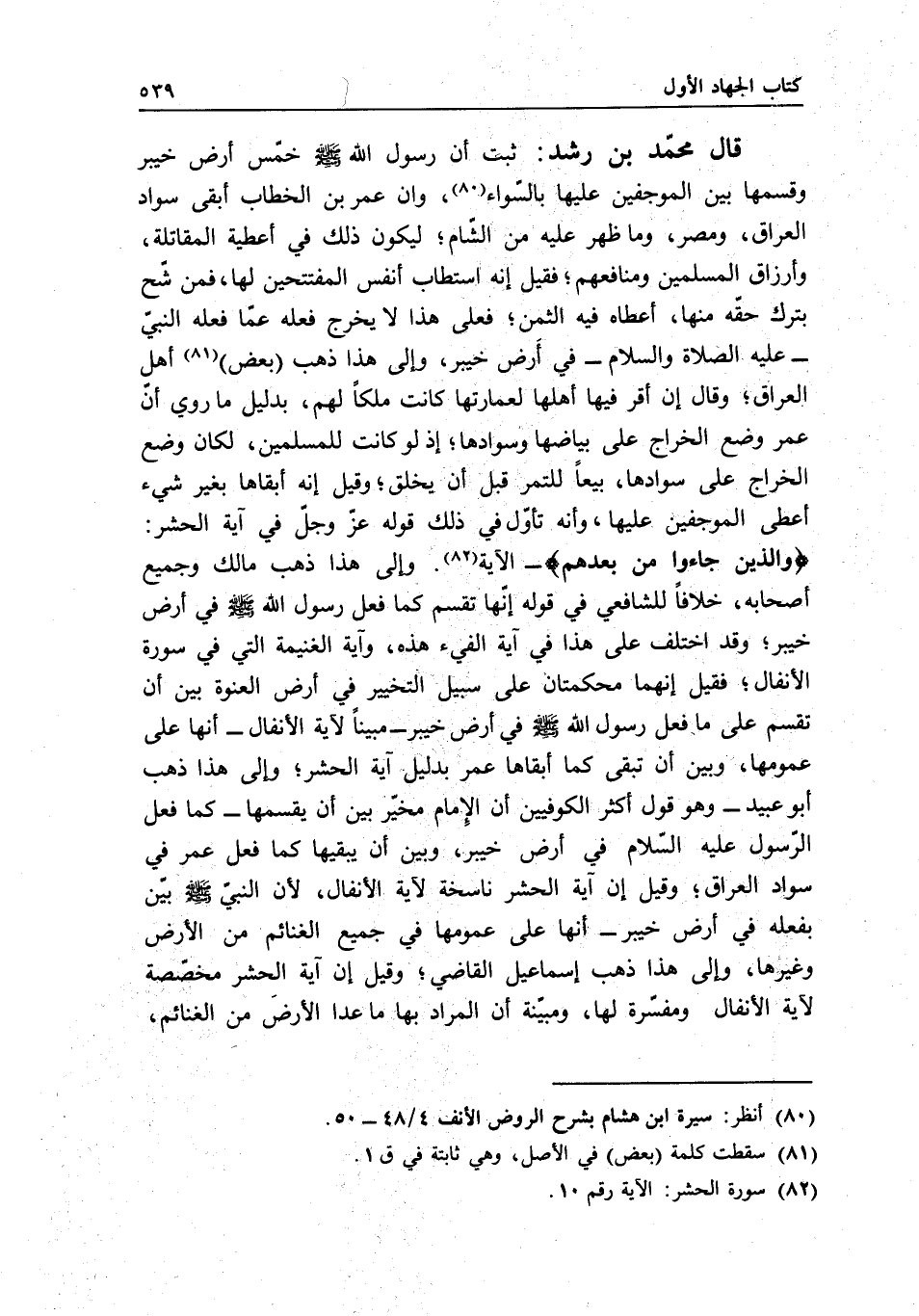 قال محمد بن رشد: ثبت أن رسول الله - صَلَّى اللَّهُ عَلَيْهِ وَسَلَّمَ - خمس أرض خيبر وقسمها بين الموجفين عليها بالسواء، وأن عمر بن الخطاب أبقى سواد العراق، ومصر، وما ظهر عليه من الشام؛ ليكون ذلك في أعطية المقاتلة، وأرزاق المسلمين ومنافعهم؛ فقيل إنه استطاب أنفس المفتتحين لها، فمن شح بترك حقه منها، أعطاه فيه الثمن؛ فعلى هذا لا يخرج فعله عما فعله النبي - عَلَيْهِ الصَّلَاةُ وَالسَّلَامُ - في أرض خيبر، وإلى هذا ذهب بعض أهل العراق؛ وقال إن أقر فيها أهلها لعمارتها كانت ملكا لهم، بدليل ما روي أن عمر وضع الخراج على بياضها وسوادها؛ إذ لو كانت للمسلمين، لكان وضع الخراج على سوادها، بيعا للتمر قبل أن يخلق، وقيل إنه أبقاها بغير شيء أعطى الموجفين عليها، وأنه تأول في ذلك قوله عز وجل في آية الحشر: {وَالَّذِينَ جَاءُوا مِنْ بَعْدِهِمْ} [الحشر: 10]- الآية. وإلى هذا ذهب مالك وجميع أصحابه، خلافا للشافعي في قوله إنها تقسم كما فعل رسول الله - صَلَّى اللَّهُ عَلَيْهِ وَسَلَّمَ - في أرض خيبر؛ وقد اختلف على هذا في آية الفيء هذه، وآية الغنيمة التي في سورة الأنفال، فقيل إنهما محكمتان على سبيل التخيير في أرض العنوة بين أن تقسم على ما فعل رسول الله - صَلَّى اللَّهُ عَلَيْهِ وَسَلَّمَ - في أرض خيبر - مبينا لآية الأنفال - أنها على عمومها، وبين أن تبقى كما أبقاها عمر بدليل آية الحشر؛ وإلى هذا ذهب أبو عبيد - وهو قول أكثر الكوفيين أن الإمام مخير بين أن يقسمها - كما فعل الرسول - عَلَيْهِ السَّلَامُ - في أرض خيبر، وبين أن يبقيها كما فعل عمر في سواد العراق؛ وقيل إن آية الحشر ناسخة لآية الأنفال؛ لأن النبي - صَلَّى اللَّهُ عَلَيْهِ وَسَلَّمَ - بين بفعله في أرض خيبر - أنها على عمومها في جميع الغنائم من الأرض وغيرها، وإلى هذا ذهب إسماعيل القاضي؛ وقيل إن آية الحشر مخصصة لآية الأنفال ومفسرة لها، ومبينة أن المراد بها ما عدا الأرض من الغنائم،