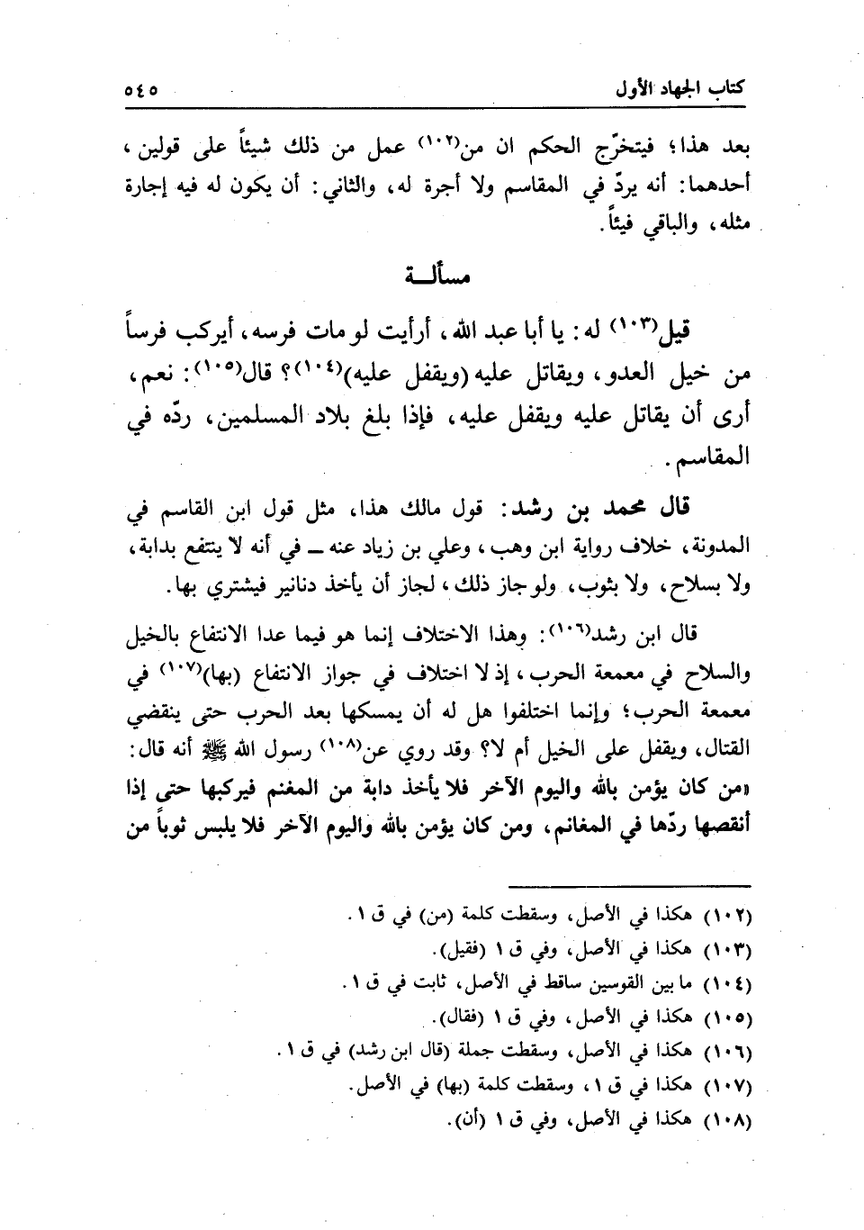 مسألة قيل له: يا أبا عبد الله، أرأيت لو مات فرسه، أيركب فرسا من خيل العدو، ويقاتل عليه ويقفل عليه؟ قال: نعم، أرى أن يقاتل عليه ويقفل عليه، فإذا بلغ بلاد المسلمين، رده في المقاسم.