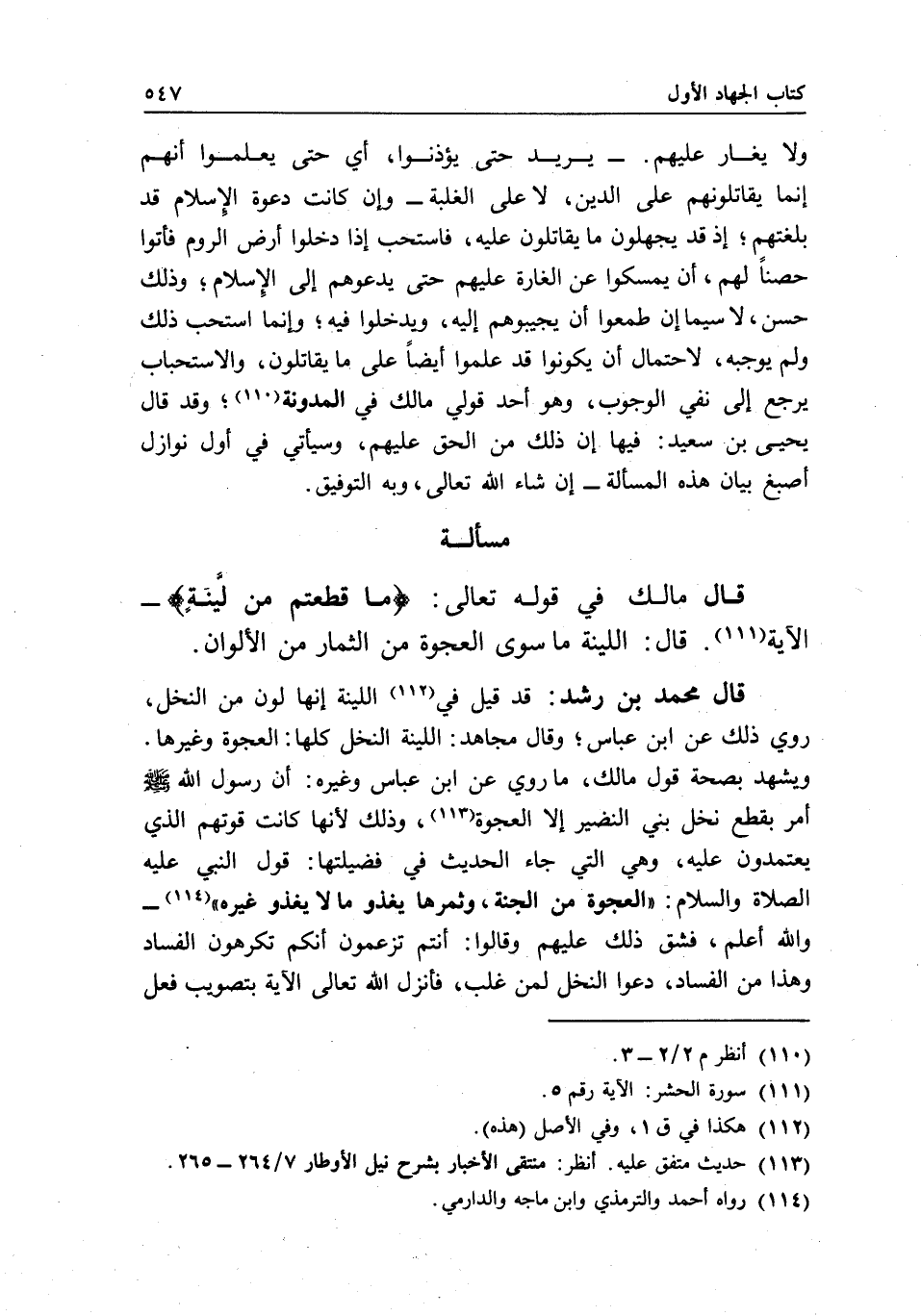 قال محمد بن رشد: قد قيل في اللينة إنها لون من النخل، روي ذلك عن ابن عباس، وقال مجاهد: اللينة النخل كلها: العجوة وغيرها. ويشهد بصحة قول مالك، ما روي عن ابن عباس وغيره: أن رسول الله - صَلَّى اللَّهُ عَلَيْهِ وَسَلَّمَ - أمر بقطع نخل بني النضير إلا العجوة، وذلك لأنها كانت قوتهم الذي يعتمدون عليه، وهي التي جاء الحديث في فضيلتها: قول النبي - عَلَيْهِ الصَّلَاةُ وَالسَّلَامُ -: «العجوة من الجنة» ، وثمرها يغذو ما لا يغذو غيره - والله أعلم، فشق ذلك عليهم وقالوا: أنتم تزعمون أنكم تكرهون الفساد وهذا من الفساد، دعوا النخل لمن غلب، فأنزل الله تعالى الآية بتصويب فعل