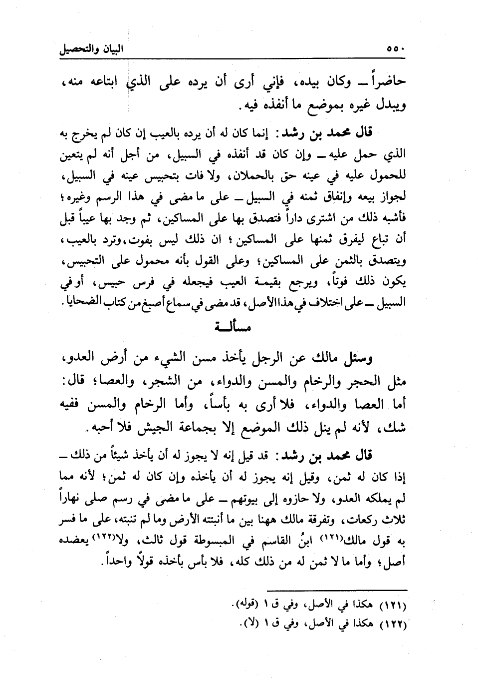 مسألة وسئل مالك عن الرجل يأخذ مسن الشيء من أرض العدو، مثل الحجر والرخام والمسن والدواء، من الشجر، والعصا؛ قال: أما العصا والدواء، فلا أرى به بأسا، وأما الرخام والمسن ففيه شك؛ لأنه لم ينل ذلك الموضع إلا بجماعة الجيش فلا أحبه.