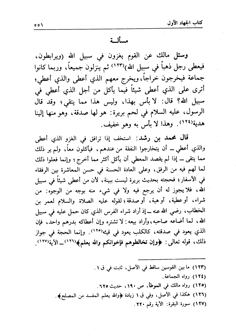 مسألة وسئل مالك عن القوم يغزون في سبيل الله ويرابطون، فيعطى رجل ذهبا في سبيل الله ثم ينزلون جميعا، وربما كانوا جماعة فيخرجون خراجا، ويخرج معهم الذي أعطى والذي أعطي؛ أترى على الذي أعطى شيئا فيما يأكل من أجل الذي أعطي في سبيل الله؟ قال: لا بأس بهذا، وليس هذا مما يتقي؛ وقد قال الرسول، - عَلَيْهِ السَّلَامُ - في لحم بريرة: هو لها صدقة، وهو منها إلينا هدية. وهذا لا بأس به وهو خفيف.