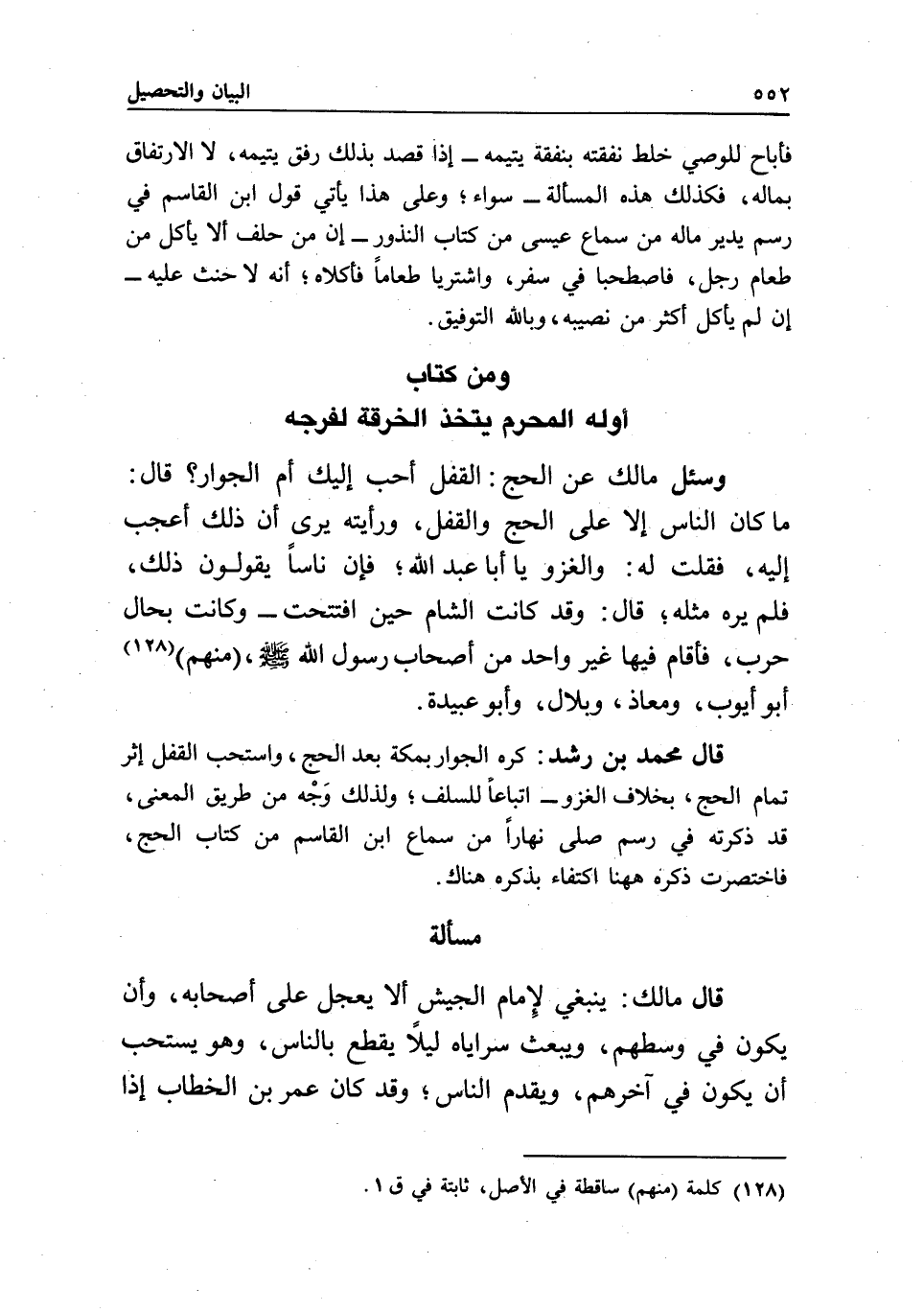 وسئل مالك عن الحج: القفل أحب إليك أم الجوار؟ قال: ما كان الناس إلا على الحج والقفل، ورأيته يرى أن ذلك أعجب إليه، فقلت له: والغزو يا أبا عبد الله؟ فإن ناسا يقولون ذلك، فلم يره مثله، قال: وقد كانت الشام حين افتتحت - وكانت بحال حرب، فأقام فيها غير واحد من أصحاب رسول الله - صَلَّى اللَّهُ عَلَيْهِ وَسَلَّمَ -، منهم أبو أيوب، ومعاذ، وبلال، وأبو عبيدة.