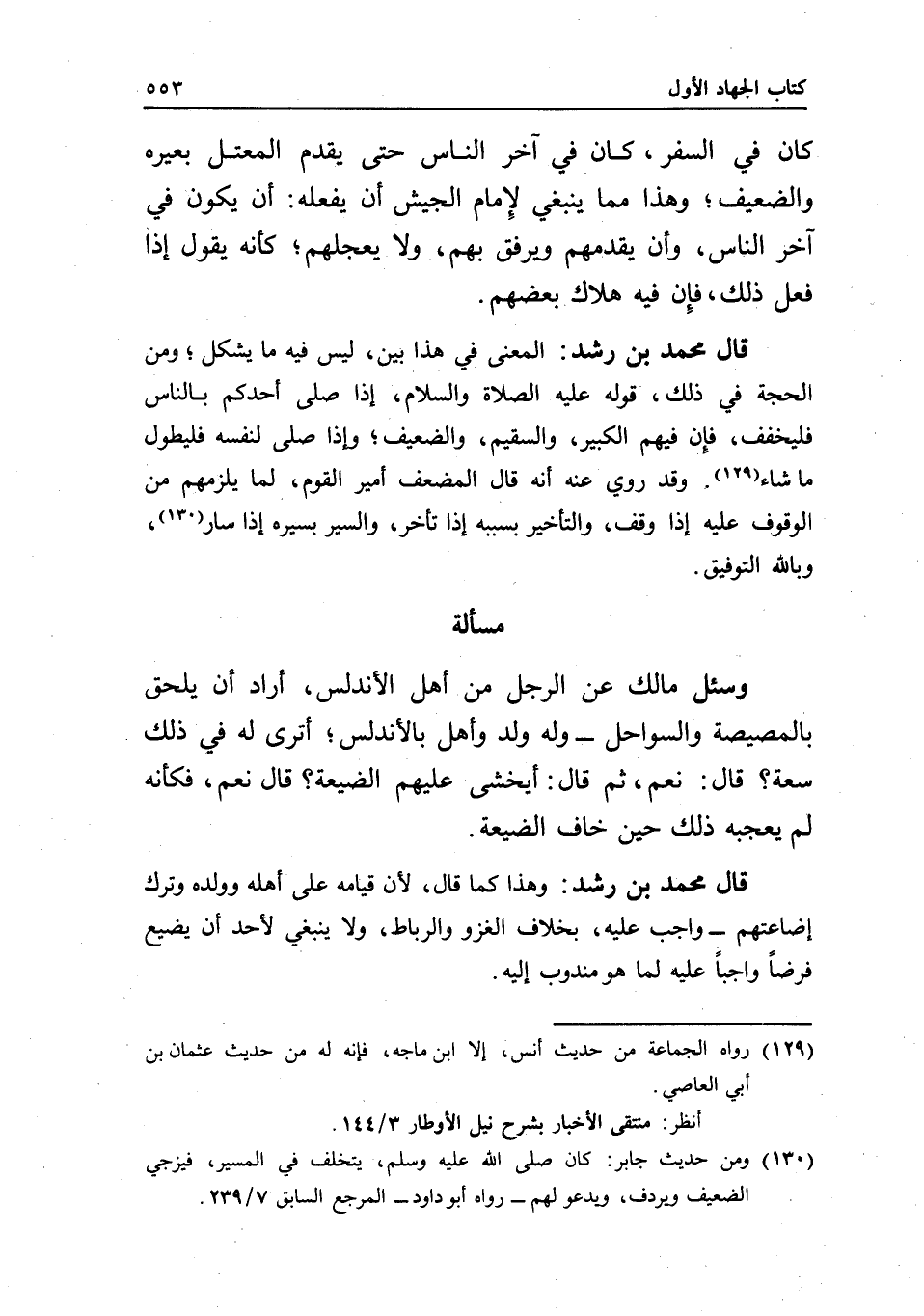 مسألة وسئل مالك عن الرجل من أهل الأندلس، أراد أن يلحق بالمصيصة والسواحل - وله ولد وأهل بالأندلس؛ أترى له في ذلك سعة؟ قال: نعم، ثم قال: أيخشى عليهم الضيعة؟ قال: نعم، فكأنه لم يعجبه ذلك حين خاف الضيعة.