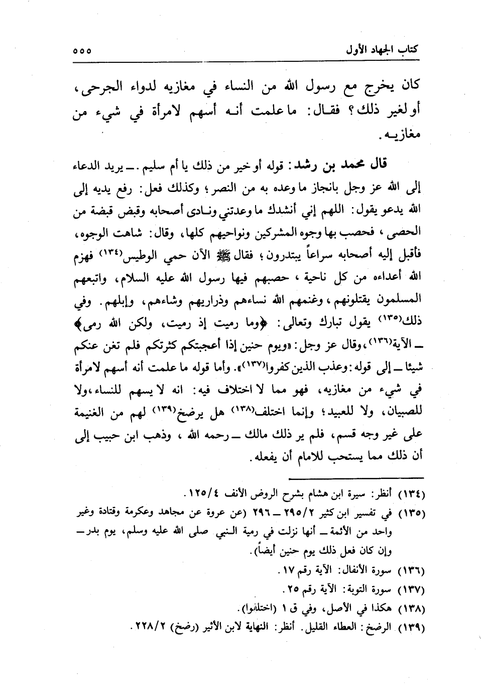 قال محمد بن رشد: قوله أو خير من ذلك يا أم سليم - يريد الدعاء إلى الله عز وجل بإنجاز ما وعده به من النصر؛ وكذلك فعل: رفع يديه إلى الله يدعو يقول: اللهم إني أنشدك ما وعدتني ونادى أصحابه وقبض قبضة من الحصى، فحصب بها وجوه المشركين ونواحيهم كلها، وقال: شاهت الوجوه، فأقبل إليه أصحابه سراعا يبتدرون، فقال - صَلَّى اللَّهُ عَلَيْهِ وَسَلَّمَ - الآن حمي الوطيس فهزم الله أعداءه من كل ناحية، حصبهم فيها رسول الله - عَلَيْهِ السَّلَامُ -، وأتبعهم المسلمون يقتلونهم، وغنمهم الله نساءهم وذراريهم وشاءهم، وإبلهم. وفي ذلك يقول تبارك وتعالى: {وَمَا رَمَيْتَ إِذْ رَمَيْتَ وَلَكِنَّ اللَّهَ رَمَى} [الأنفال: 17]- الآية، وقال عز وجل: {وَيَوْمَ حُنَيْنٍ إِذْ أَعْجَبَتْكُمْ كَثْرَتُكُمْ فَلَمْ تُغْنِ عَنْكُمْ شَيْئًا} [التوبة: 25]- إلى قوله: {وَعَذَّبَ الَّذِينَ كَفَرُوا} [التوبة: 26] . وأما قوله ما علمت أنه أسهم لامرأة في شيء من مغازيه، فهو مما لا اختلاف فيه: أنه لا يسهم للنساء، ولا للصبيان، ولا للعبيد؛ وإنما اختلف هل يرضخ لهم من الغنيمة على غير وجه قسم، فلم ير ذلك مالك - رَحِمَهُ اللَّهُ -، وذهب ابن حبيب إلى أن ذلك مما يستحب للإمام أن يفعله.
