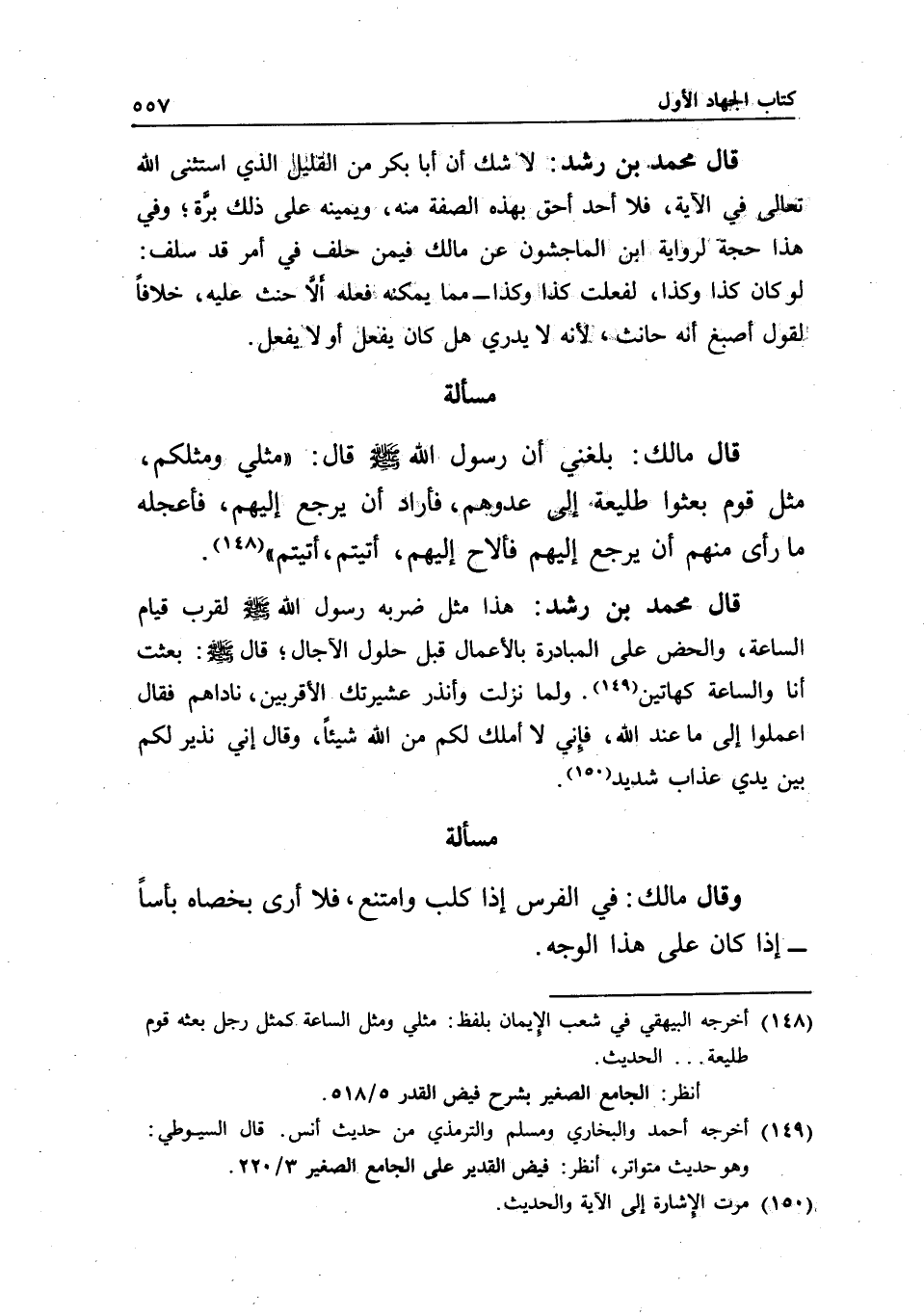 مسألة قال مالك: بلغني أن رسول الله - صَلَّى اللَّهُ عَلَيْهِ وَسَلَّمَ - قال: «مثلي ومثلكم، مثل قوم بعثوا طليعة إلى عدوهم، فأراد أن يرجع إليهم، فأعجله ما رأى منهم أن يرجع إليهم فألاح إليهم، أتيتم، أتيتم» .