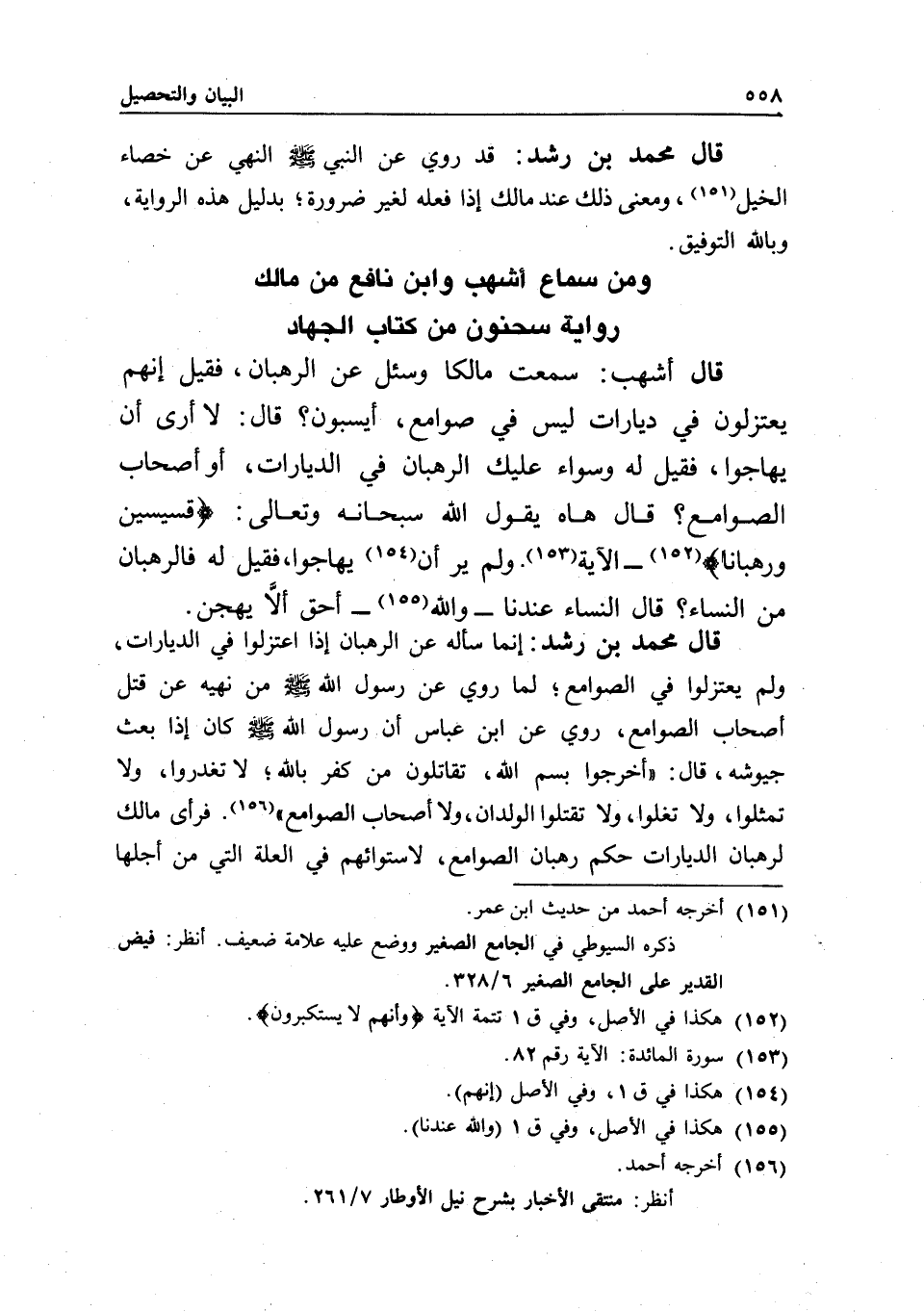 قال محمد بن رشد: إنما سأله عن الرهبان إذا اعتزلوا في الديارات، ولم يعتزلوا في الصوامع؛ لما روي عن رسول الله - صَلَّى اللَّهُ عَلَيْهِ وَسَلَّمَ - من نهيه عن قتل أصحاب الصوامع، روي عن ابن عباس أن رسول الله - صَلَّى اللَّهُ عَلَيْهِ وَسَلَّمَ - كان إذا بعث جيوشه، قال: «اخرجوا بسم الله، تقاتلون من كفر بالله، لا تغدروا، ولا تمثلوا، ولا تغلوا، ولا تقتلوا الولدان، ولا أصحاب الصوامع» . فرأى مالك لرهبان الديارات حكم رهبان الصوامع، لاستوائهم في العلة التي من أجلها