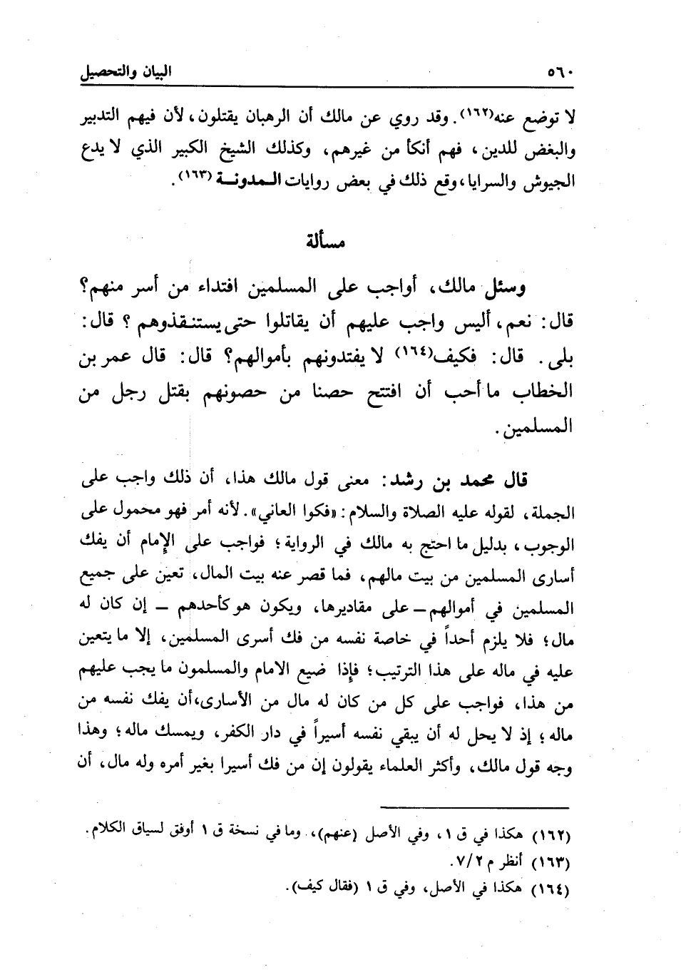 مسألة وسئل مالك، أواجب على المسلمين افتداء من أسر منهم؟ قال: نعم، أليس واجب عليهم أن يقاتلوا حتى يستنقذوهم؟ قال: بلى. قال: فكيف لا يفتدونهم بأموالهم؟ قال: قال عمر بن الخطاب: ما أحب أن افتتح حصنا من حصونهم بقتل رجل من المسلمين.