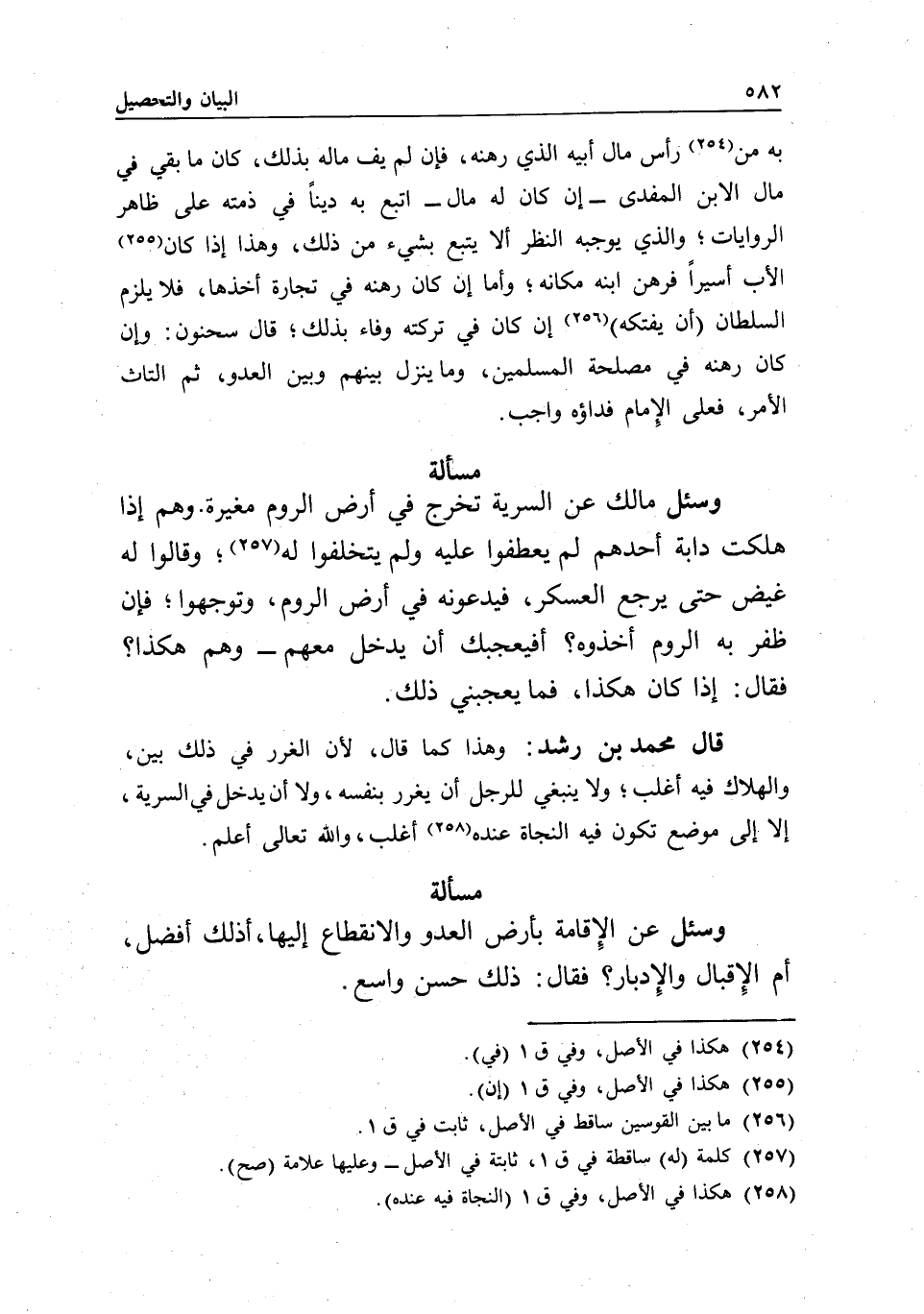 مسألة وسئل عن الإقامة بأرض العدو والانقطاع إليها، أذلك أفضل، أم الإقبال والإدبار؟ فقال: ذلك حسن واسع.