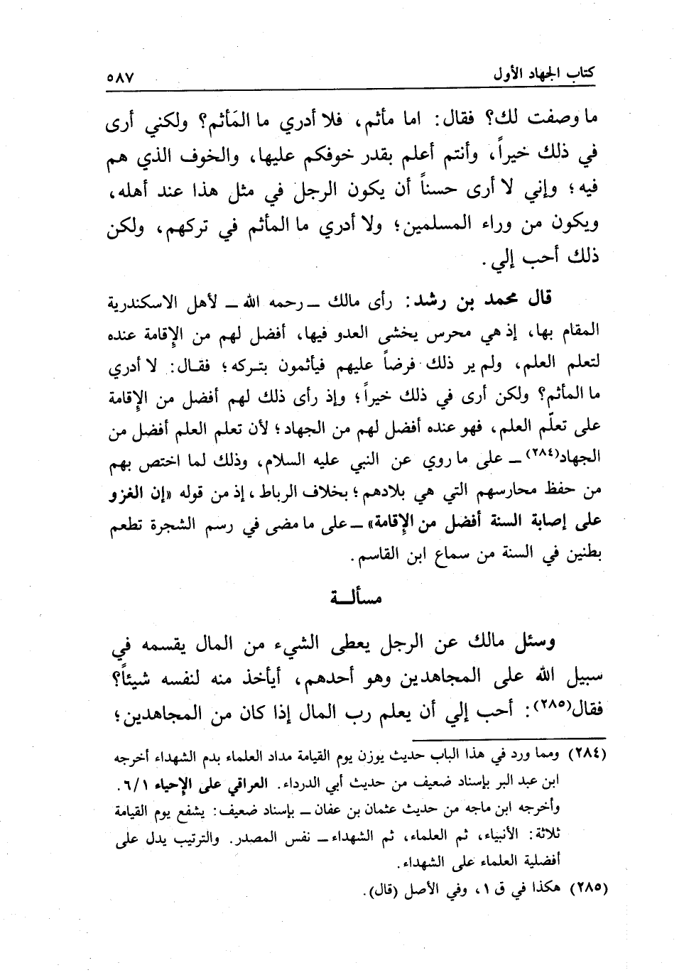 قال محمد بن رشد: رأى مالك - رَحِمَهُ اللَّهُ - لأهل الإسكندرية المقام بها، إذ هي محرس يخشى العدو فيها، أفضل لهم من الإقامة عنده لتعلم العلم، ولم ير ذلك فرضا عليهم فيأثمون بتركه؛ فقال: لا أدري ما المأثم؟ ولكن أرى في ذلك خيرا؛ وإذ رأى ذلك لهم أفضل من الإقامة على تعلم العلم، فهو عنده أفضل لهم من الجهاد؛ لأن تعلم العلم أفضل من الجهاد - على ما روي عن النبي - عَلَيْهِ السَّلَامُ -، وذلك لما اختص بهم من حفظ محارسهم التي هي بلادهم، بخلاف الرباط، إذ من قوله " إن الغزو على إصابة السنة أفضل من الإقامة " - على ما مضى في رسم "الشجرة تطعم بطنين في السنة" من سماع ابن القاسم.