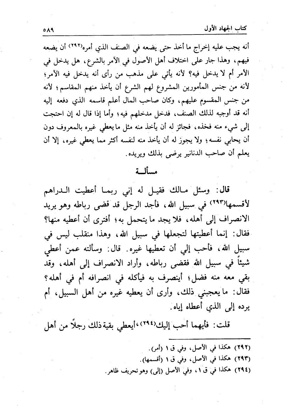 مسألة قال: وسئل مالك فقيل له: إني ربما أعطيت الدراهم لأقسمها في سبيل الله، فأجد الرجل قد قضى رباطه وهو يريد الانصراف إلى أهله، فلا يجد ما يتحمل به؛ أفترى أن أعطيه منها؟ فقال: إنما أعطيتها لتجعلها في سبيل الله، وهذا منقلب ليس في سبيل الله، فأحب إلي أن تعطيها غيره. قال: وسألته عمن أعطي شيئا في سبيل الله فقضى رباطه، وأراد الانصراف إلى أهله، وقد بقي معه منه فضل؛ أينصرف به فيأكله في انصرافه أم في أهله؟ فقال: ما يعجبني ذلك، وأرى أن يعطيه غيره من أهل السبيل، أم يرده إلى الذي أعطاه إياه.