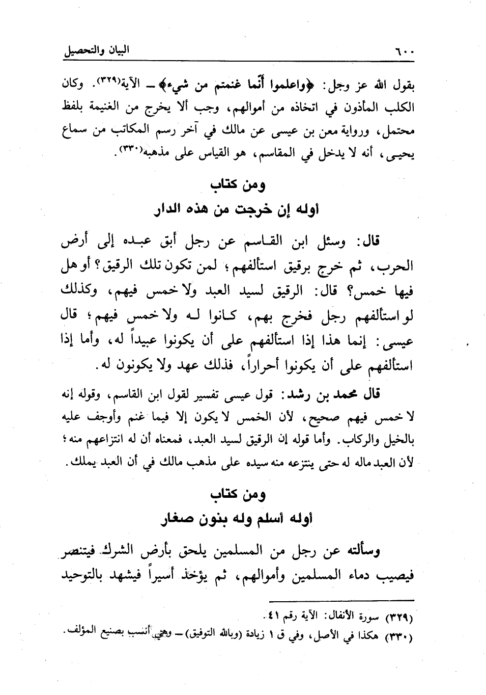 قال محمد بن رشد: قول عيسى تفسير لقول ابن القاسم، وقوله إنه لا خمس فيهم صحيح؛ لأن الخمس لا يكون إلا فيما غنم وأوجف عليه بالخيل والركاب. وأما قوله إن الرقيق لسيد العبد، فمعناه أن له انتزاعهم منه؛ لأن العبد ماله له حتى ينتزعه منه سيده على مذهب مالك في أن العبد يملك.