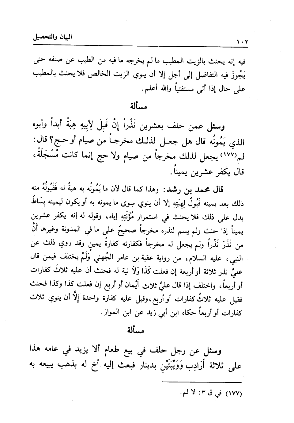 قال محمد بن رشد: وهذا كما قال؛ لأن ما يمونه به هبة له، فقبوله منه ذلك بعد يمينه قبول لهبته، إلا أن ينوي سوى ما يمونه به، أو يكون ليمينه بساط يدل على ذلك، فلا يحنث في استمرار مؤنته إياه، وقوله له: إنه يكفر عشرين يمينا إذا حنث، ولم يسم لنذره مخرجا، صحيح على ما في المدونة وغيرها أن من نذر نذرا، ولم يجعل له مخرجا، فكفارته كفارة يمين، وقد روي ذلك عن النبي - عَلَيْهِ السَّلَامُ -، من رواية عقبة بن عامر الجهني، ولم يختلف فيمن قال: علي نذر ثلاثة أو أربعة إن فعلت كذا، ولا نية له، فحنث أن عليه ثلاث كفارات أو أربعا، واختلف إذا قال: علي ثلاثة أيمان أو أربعة إن فعلت كذا وكذا، فحنث فقيل: عليه ثلاث كفارات أو أربع، وقيل: عليه كفارة واحدة، إلا أن ينوي ثلاث كفارات أو أربعا، حكاه ابن أبي زيد، عن ابن المواز.