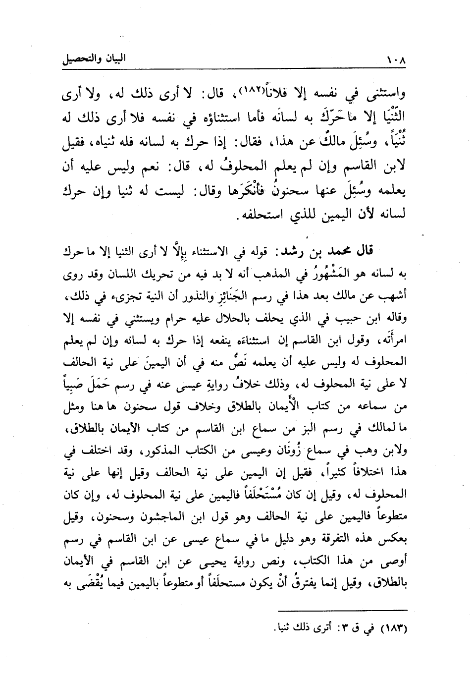قال محمد بن رشد: قوله في الاستثناء بإلا لا أرى الثنيا إلا ما حرك به لسانه، هو المشهور في المذهب أنه لا بد فيه من تحريك اللسان، وقد روى أشهب عن مالك بعد هذا في رسم الجنائز والنذور: أن النية تجزئ في ذلك، وقاله ابن حبيب في الذي يحلف بالحلال عليه حرام، ويستثني في نفسه إلا امرأته، وقول ابن القاسم: إن استثناءه ينفعه إذا حرك به لسانه، وإن لم يعلم المحلوف له، وليس عليه أن يعلمه نص منه في أن اليمين على نية الحالف لا على نية المحلوف له، وذلك خلاف رواية عيسى عنه في رسم حمل صبيا من سماعه، من كتاب الأيمان بالطلاق، وخلاف قول سحنون هاهنا، ومثل ما لمالك في رسم البز، من سماع ابن القاسم، من كتاب الأيمان بالطلاق، ولابن وهب في سماع زونان وعيسى من الكتاب المذكور، وقد اختلف في هذا اختلافا كثيرا، فقيل: إن اليمين على نية الحالف، وقيل: إنها على نية المحلوف له، وقيل: إن كان مستحلفا فاليمين على نية المحلوف له، وإن كان متطوعا فاليمين على نية الحالف، وهو قول ابن الماجشون وسحنون، وقيل بعكس هذه التفرقة، وهو دليل ما في سماع عيسى، عن ابن القاسم، في رسم أوصى، من هذا الكتاب، ونص رواية يحيى، عن ابن القاسم في الأيمان بالطلاق، وقيل: إنما يفترق أن يكون مستحلفا أو متطوعا باليمين فيما يقضى به