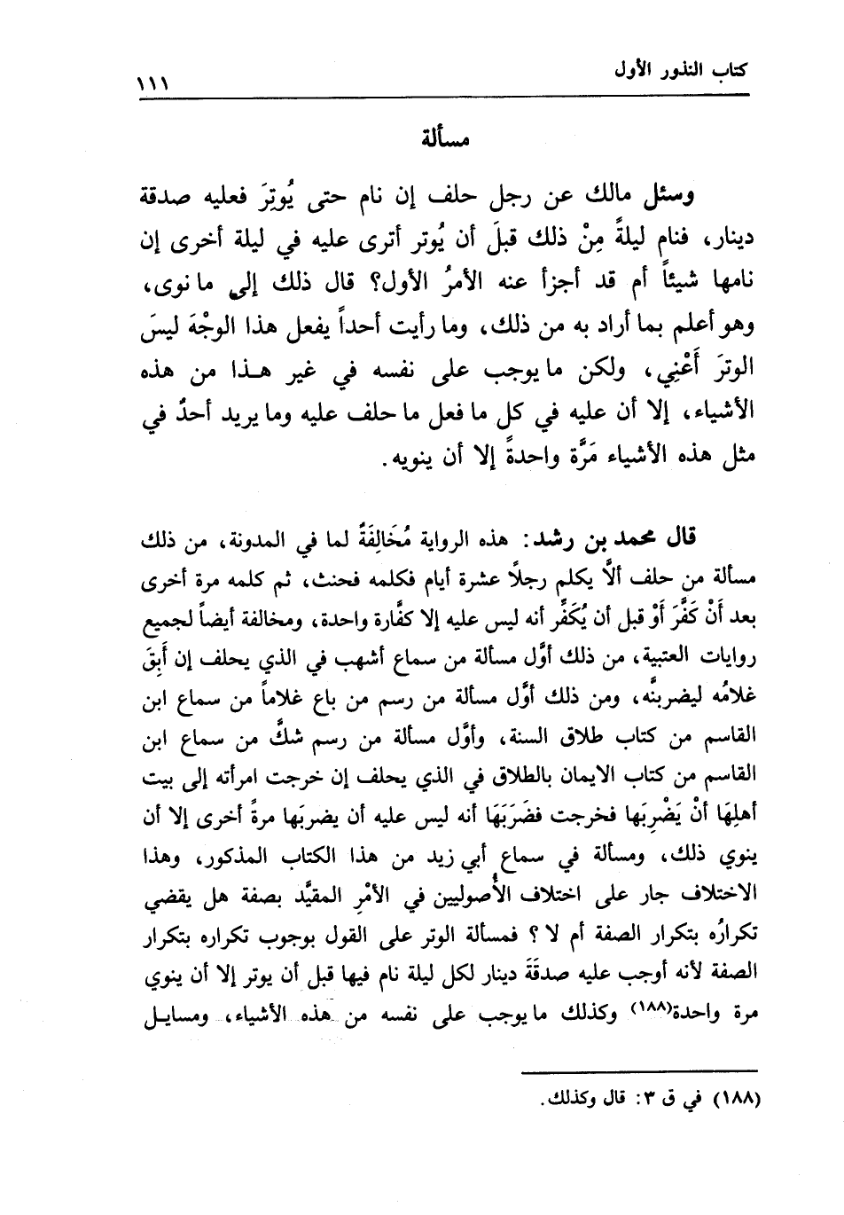 قال محمد بن رشد: هذه الرواية مخالفة لما في المدونة، من ذلك مسألة من حلف ألا يكلم رجلا عشرة أيام، فكلمه فحنث، ثم كلمه مرة أخرى بعد أن كفر أو قبل أن يكفر، أنه ليس عليه إلا كفارة واحدة، ومخالفة أيضا لجميع روايات العتبية، من ذلك أول مسألة من سماع أشهب، في الذي يحلف إن أبق غلامه ليضربنه، ومن ذلك أول مسألة من رسم من باع غلاما، من سماع ابن القاسم، من كتاب طلاق السنة، وأول مسألة من رسم شك، من سماع ابن القاسم، من كتاب الأيمان بالطلاق، في الذي يحلف إن خرجت امرأته إلى بيت أهلها أن يضربها، فخرجت فضربها؛ أنه ليس عليه أن يضربها مرة أخرى، إلا أن ينوي ذلك، ومسألة في سماع أبي زيد، من هذا الكتاب المذكور، وهذا الاختلاف جار على اختلاف الأصوليين في الأمر المقيد بصفة هل يقضي تكراره بتكرار الصفة أم لا؟ فمسألة الوتر على القول بوجوب تكراره بتكرار الصفة؛ لأنه أوجب عليه صدقة دينار لكل ليلة نام فيها قبل أن يوتر، إلا أن ينوي مرة واحدة، وكذلك ما يوجب على نفسه من هذه الأشياء، ومسايل