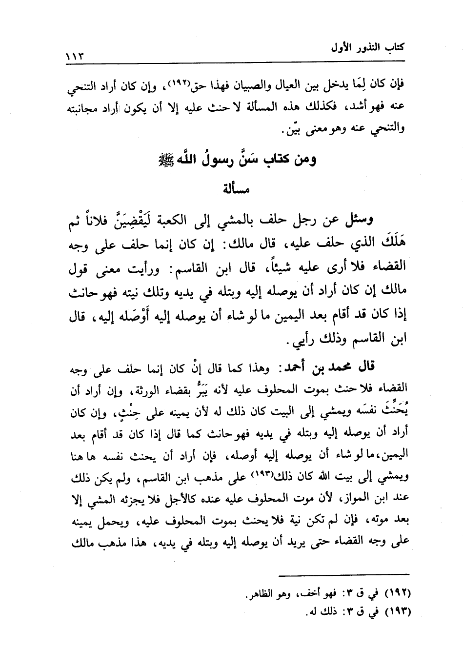 ومن كتاب سن رسول الله - صَلَّى اللَّهُ عَلَيْهِ وَسَلَّمَ - مسألة وسئل عن رجل حلف بالمشي إلى الكعبة ليقضين فلانا، ثم هلك الذي حلف عليه، قال مالك: إن كان إنما حلف على وجه القضاء، فلا أرى عليه شيئا، قال ابن القاسم: ورأيت معنى قول مالك: إن كان أراد أن يوصله إليه وبتله في يديه، وتلك نيته، فهو حانث إذا كان قد أقام بعد اليمين ما لو شاء أن يوصله إليه أوصله إليه، قال ابن القاسم: وذلك رأيي.