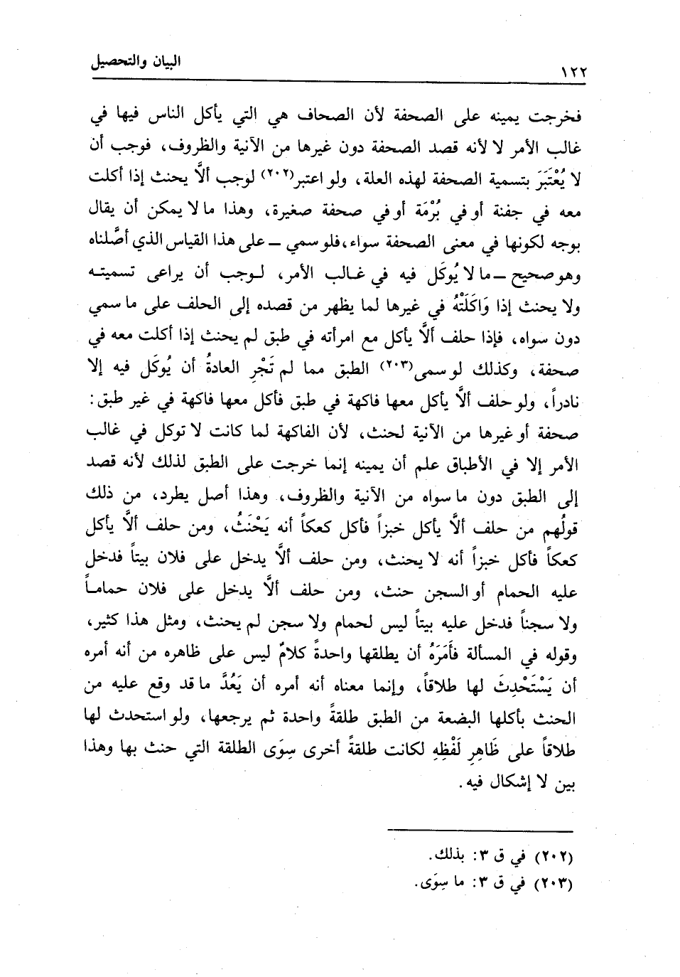 فخرجت يمينه على الصحفة؛ لأن الصحاف هي التي يأكل الناس فيها في غالب الأمر، لا لأنه قصد الصحفة دون غيرها من الآنية والظروف، فوجب أن لا يعتبر بتسمية الصحفة لهذه العلة، ولو اعتبر لوجب ألا يحنث إذا أكلت معه في جفنة أو في برمة، أو في صحفة صغيرة، وهذا ما لا يمكن أن يقال بوجه؛ لكونها في معنى الصحفة سواء، فلو سمي - على هذا القياس الذي أصلناه وهو صحيح - ما لا يوكل فيه في غالب الأمر، لوجب أن يراعى تسميته، ولا يحنث إذا واكلته في غيرها؛ لما يظهر من قصده إلى الحلف على ما سمي دون سواه، فإذا حلف ألا يأكل مع امرأته في طبق لم يحنث إذا أكلت معه في صحفة، وكذلك لو سمى الطبق مما لم تجر العادة أن يوكل فيه إلا نادرا، ولو حلف ألا يأكل معها فاكهة في طبق، فأكل معها فاكهة في غير طبق صحفة أو غيرها من الآنية لحنث؛ لأن الفاكهة لما كانت لا توكل في غالب الأمر إلا في الأطباق علم أن يمينه إنما خرجت على الطبق لذلك؛ لأنه قصد إلى الطبق دون ما سواه من الآنية والظروف، وهذا أصل يطرد.