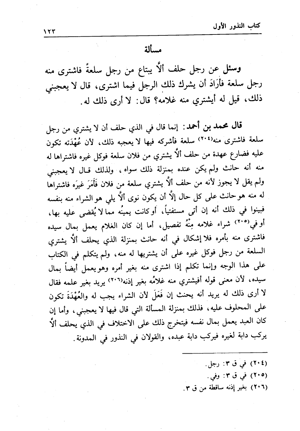 قال محمد بن أحمد: إنما قال في الذي حلف أن لا يشتري من رجل سلعة، فاشترى منه رجل سلعة، فأشركه فيها لا يعجبه ذلك؛ لأن عهدته تكون عليه، فضارع عهدة من حلف ألا يشتري من فلان سلعة، فوكل غيره فاشتراها له منه أنه حانث، ولم يكن عنده بمنزلة ذلك سواه، ولذلك قال: لا يعجبني ولم يقل: لا يجوز؛ لأنه من حلف ألا يشتري سلعة من فلان فأمر غيره فاشتراها له منه هو حانث على كل حال، إلا أن يكون نوى ألا يلي هو الشراء منه بنفسه، فبينوا في ذلك أنه إن أتى مستفتيا، أو كانت يمينه مما لا يقضى عليه بها، أو في شراء غلامه منه تفصيل، أما إن كان الغلام يعمل بمال سيده، فاشترى منه بأمره، فلا إشكال في أنه حانث بمنزلة الذي يحلف ألا يشتري السلعة من رجل، فوكل غيره على أن يشتريها له منه، ولم يتكلم في الكتاب على هذا الوجه، وإنما تكلم إذا اشترى منه بغير أمره، وهو يعمل أيضا بمال سيده؛ لأن معنى قوله: أفيشتري منه غلامه بغير إذنه يريد بغير علمه، فقال: لا أرى ذلك له يريد أنه يحنث إن فعل؛ لأن الشراء يجب له، والعهدة تكون على المحلوف عليه، فذلك بمنزلة المسألة التي قال فيها: لا يعجبني، وأما إن كان العبد يعمل بمال نفسه، فيتخرج ذلك على الاختلاف في الذي يحلف ألا يركب دابة لغيره، فيركب دابة عبده، والقولان في النذور في المدونة.