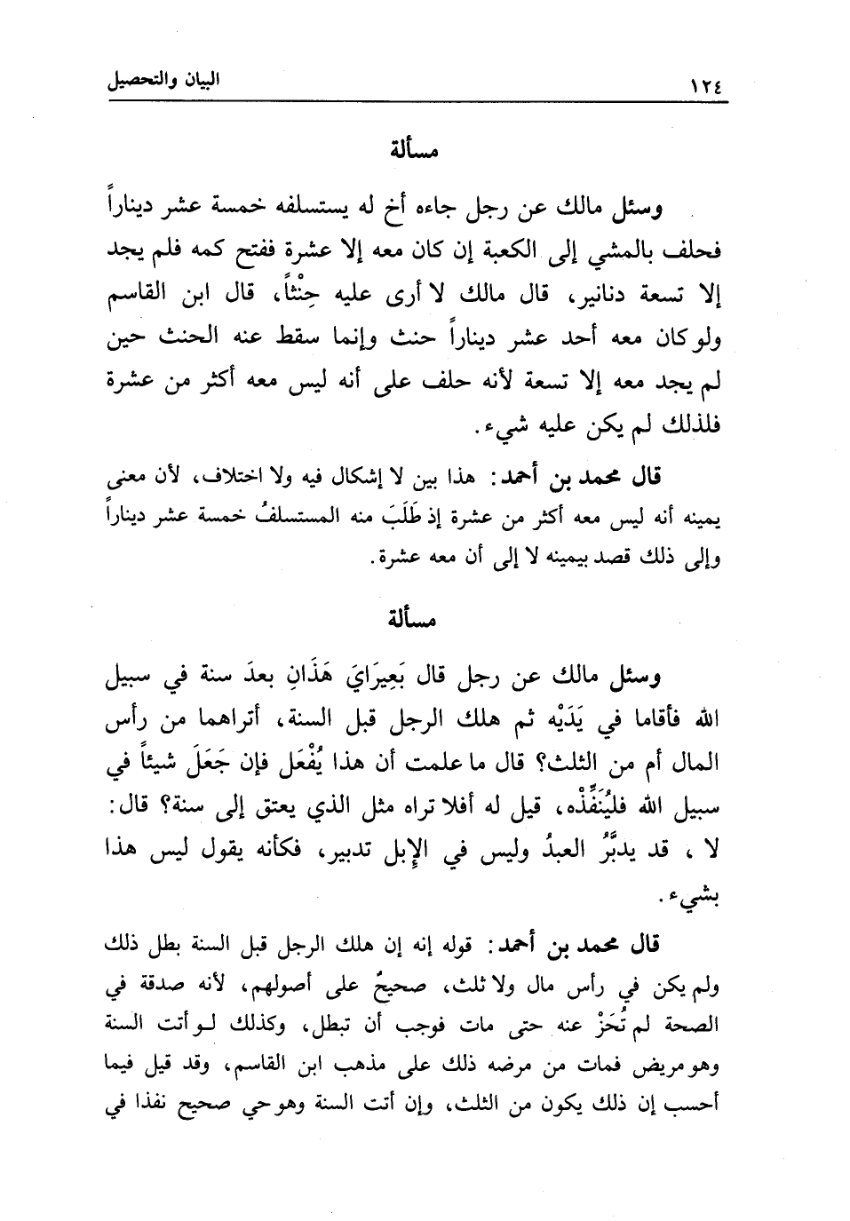 قال محمد بن أحمد: هذا بيِّن لا إشكال فيه ولا اختلاف؛ لأن معنى يمينه أنه ليس معه أكثر من عشرة إذ طلب منه المستسلف خمسة عشر دينارا، وإلى ذلك قصد بيمينه، لا إلى أن معه عشرة.