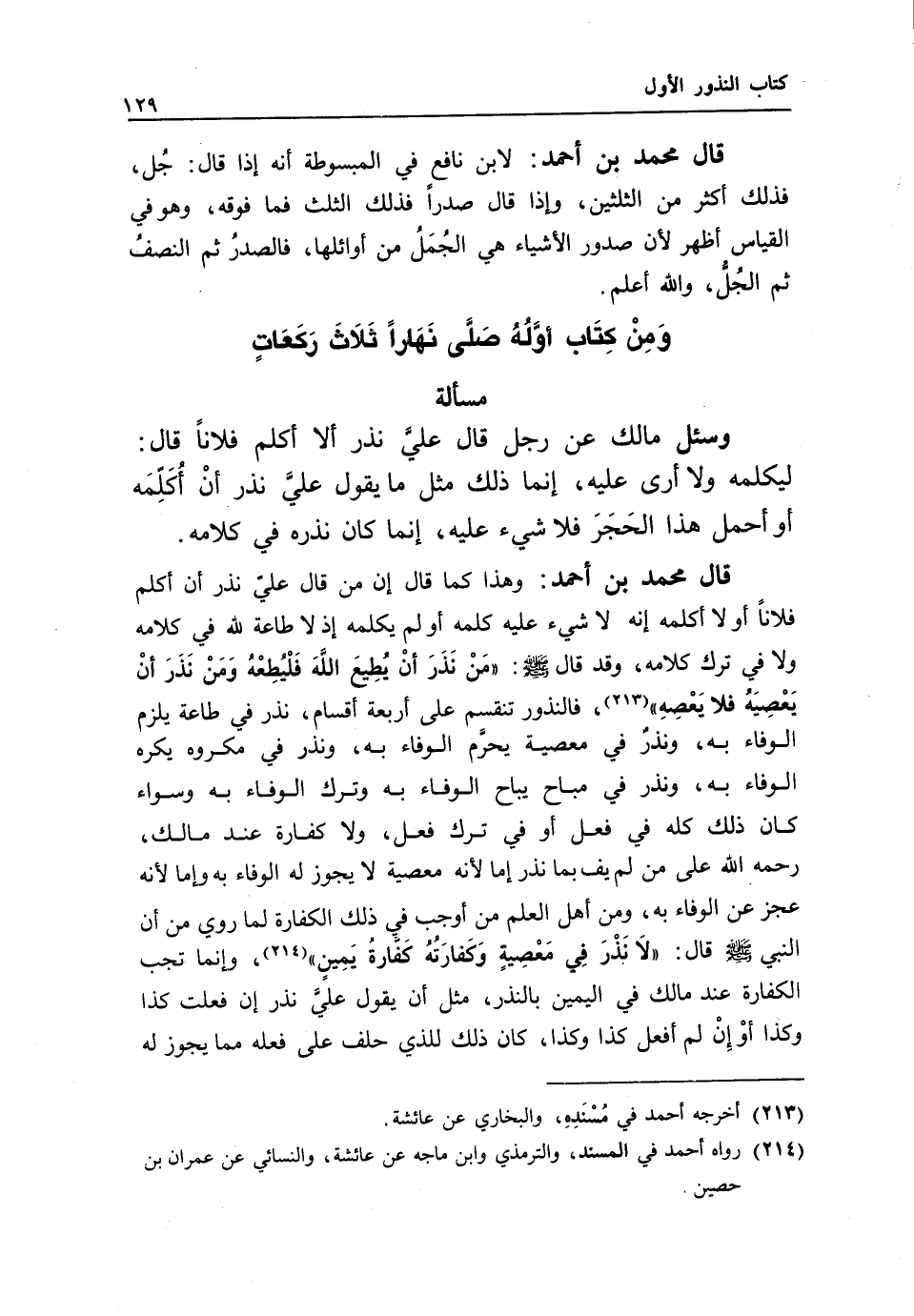 ومن كتاب أوله صلي نهارا ثلاث ركعات مسألة وسئل مالك عن رجل قال علي نذر ألا أكلم فلانا قال: ليكلمه ولا أرى عليه، إنما ذلك مثل ما يقول عليّ نذر أن أكلمه أو أحمل هذا الحجر فلا شيء عليه، إنما كان نذره في كلامه.