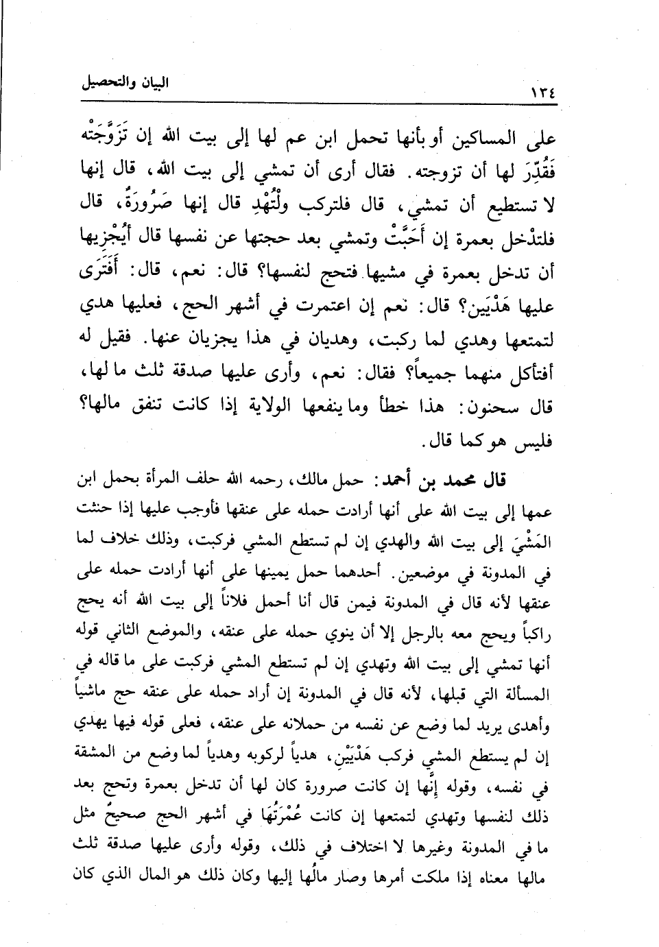 قال محمد بن أحمد: حمل مالك، - رَحِمَهُ اللَّهُ - حلف المرأة بحمل ابن عمها إلى بيت الله على أنها أرادت حمله على عنقها فأوجب عليها إذا حنثت المشي إلى بيت الله والهدي إن لم تستطع المشي فركبت، وذلك خلاف لما في المدونة في موضعين. أحدهما حمل يمينها على أنها أرادت حمله على عنقها؛ لأنه قال في المدونة فيمن قال أنا أحمل فلانا إلى بيت الله: أنه يحج راكبا ويحج معه بالرجل إلا أن ينوي حمله على عنقه، والموضع الثاني قوله: أنها تمشي إلى بيت الله وتهدي إن لم تستطع المشي فركبت على ما قاله في المسألة التي قبلها؛ لأنه قال في المدونة: إن أراد حمله على عنقه حج ماشيا وأهدى يريد لما وضع عن نفسه من حملانه على عنقه، فعلى قوله فيها: يهدي إن لم يستطع المشي فركب هديين، هديا لركوبه وهديا لما وضع من المشقة في نفسه، وقوله: إنها إن كانت صرورة كان لها أن تدخل بعمرة وتحج بعد ذلك لنفسها وتهدي لتمتعها إن كانت عمرتها في أشهر الحج صحيح مثل ما في المدونة وغيرها لا اختلاف في ذلك، وقوله وأرى عليها صدقة ثلث مالها معناه إذا ملكت أمرها وصار مالها إليها، وكان ذلك هو المال الذي كان