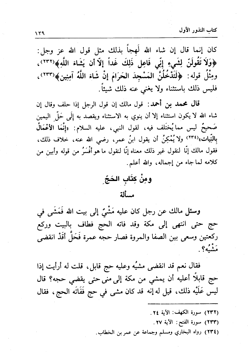 قال محمد بن أحمد: قول مالك: إن قول الرجل إذا حلف وقال إن شاء الله لا يكون استثناء إلا أن ينوي به الاستثناء ويقصد به إلى حل اليمين صحيح ليس مما يختلف فيه، لقول النبي - عَلَيْهِ السَّلَامُ -: «إنما الأعمال بالنيات» ولا يمكن أن يقول ابن عمر، - رَضِيَ اللَّهُ عَنْهُ -، خلاف ذلك، فقول مالك: إنا لنقول غير ذلك معناه إنا لنقول ما هو أفسر من قوله وأبين من كلامه لما جاء من إجماله، والله أعلم.