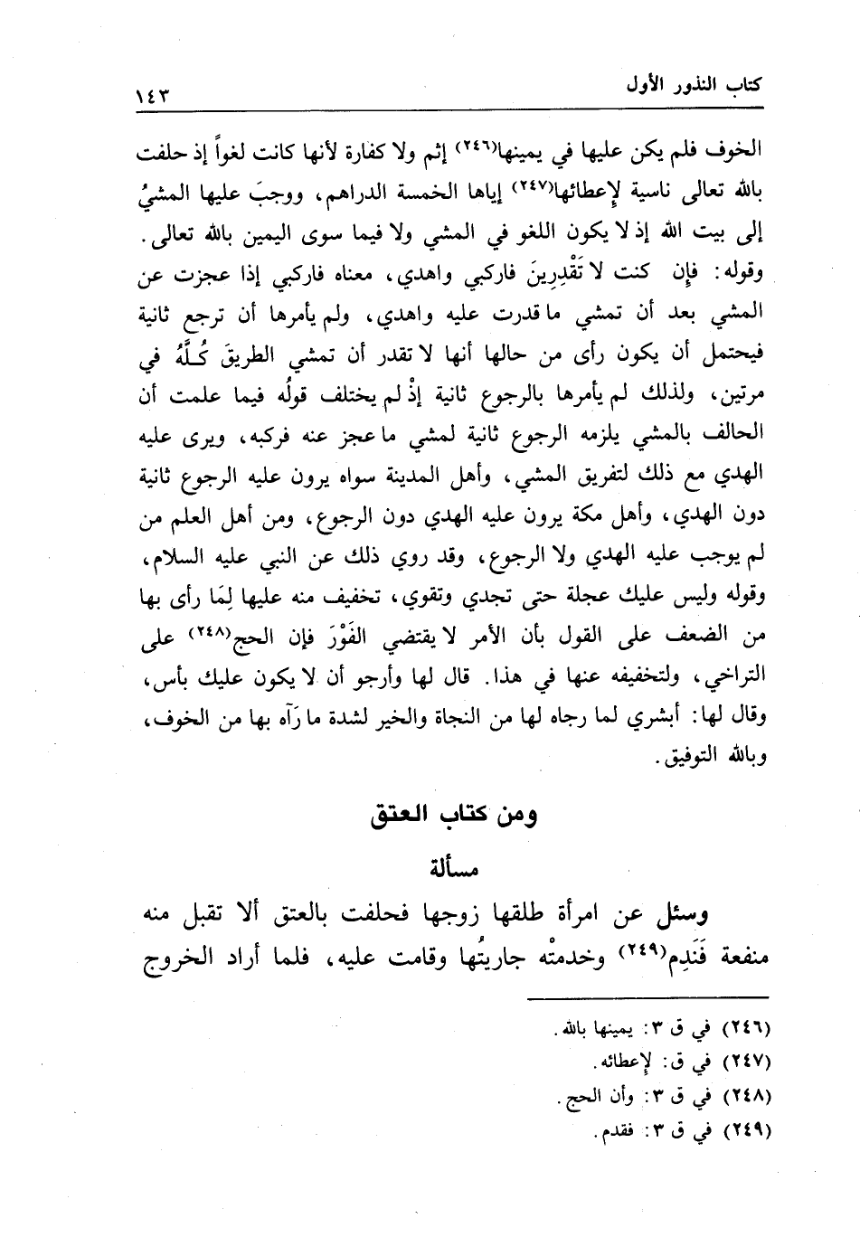 الخوف فلم يكن عليها في يمينها إثم ولا كفارة لأنها كانت لغوا إذ حلفت بالله تعالى ناسية لإعطائها إياها الخمسة الدراهم، ووجب عليها المشي إلى بيت الله إذ لا يكون اللغو في المشي ولا فيما سوى اليمين بالله تعالى. وقوله: فإن كنت لا تقدرين فاركبي واهدي، معناه فاركبي إذا عجزت عن المشي بعد أن تمشي ما قدرت عليه واهدي، ولم يأمرها أن ترجع ثانية فيحتمل أن يكون رأى من حالها أنها لا تقدر أن تمشي الطريق كله في مرتين، ولذلك لم يأمرها بالرجوع ثانية إذ لم يختلف قوله فيما علمت أن الحالف بالمشي يلزمه الرجوع ثانية لمشي ما عجز عنه فركبه، ويرى عليه الهدي مع ذلك لتفريق المشي، وأهل المدينة سواه يرون عليه الرجوع ثانية دون الهدي، وأهل مكة يرون عليه الهدي دون الرجوع، ومن أهل العلم من لم يوجب عليه الهدي ولا الرجوع، وقد روي ذلك عن النبي - عَلَيْهِ السَّلَامُ -، وقوله: وليس عليك عجلة حتى تجدي وتقوي، تخفيف منه عليها لما رأى بها من الضعف على القول بأن الأمر لا يقتضي الفور فإن الحج على التراخي، ولتخفيفه عنها في هذا. قال لها: وأرجو أن لا يكون عليك بأس، وقال لها: أبشري لما رجاه لها من النجاة والخير لشدة ما رآه بها من الخوف، وبالله التوفيق.