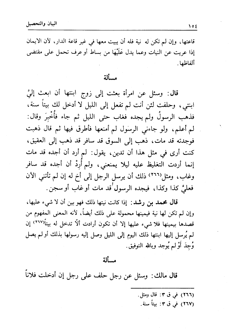 مسألة قال: وسئل عن امرأة بعثت إلى زوج ابنتها أن ابعث إلي ابنتي، وحلفت لئن أنت لم تفعل إلى الليل لا أدخل لك بيتا سنة، فذهب الرسول ولم يجده فغاب حتى الليل ثم جاء فأخبر وقال: لم أعلم، ولو جاءني الرسول لم أمنعها فأطرق فيها ثم قال: ذهبت فوجدته قد مات، ذهب إلى السوق قد سافر قد ذهب إلى العقيق، كنت أرى في مثل هذا أن تدين، يقول: لم أرد أن أجده قد مات إنما أردت التغليظ عليه لئلا يمنعني، ولم أرد أن أجده قد سافر وغاب، ومثل ذلك أن يرسل الرجل إلى أخ له إن لم تأتني الآن فعلي كذا وكذا، فيجده الرسول قد مات أو غاب أو سجن.