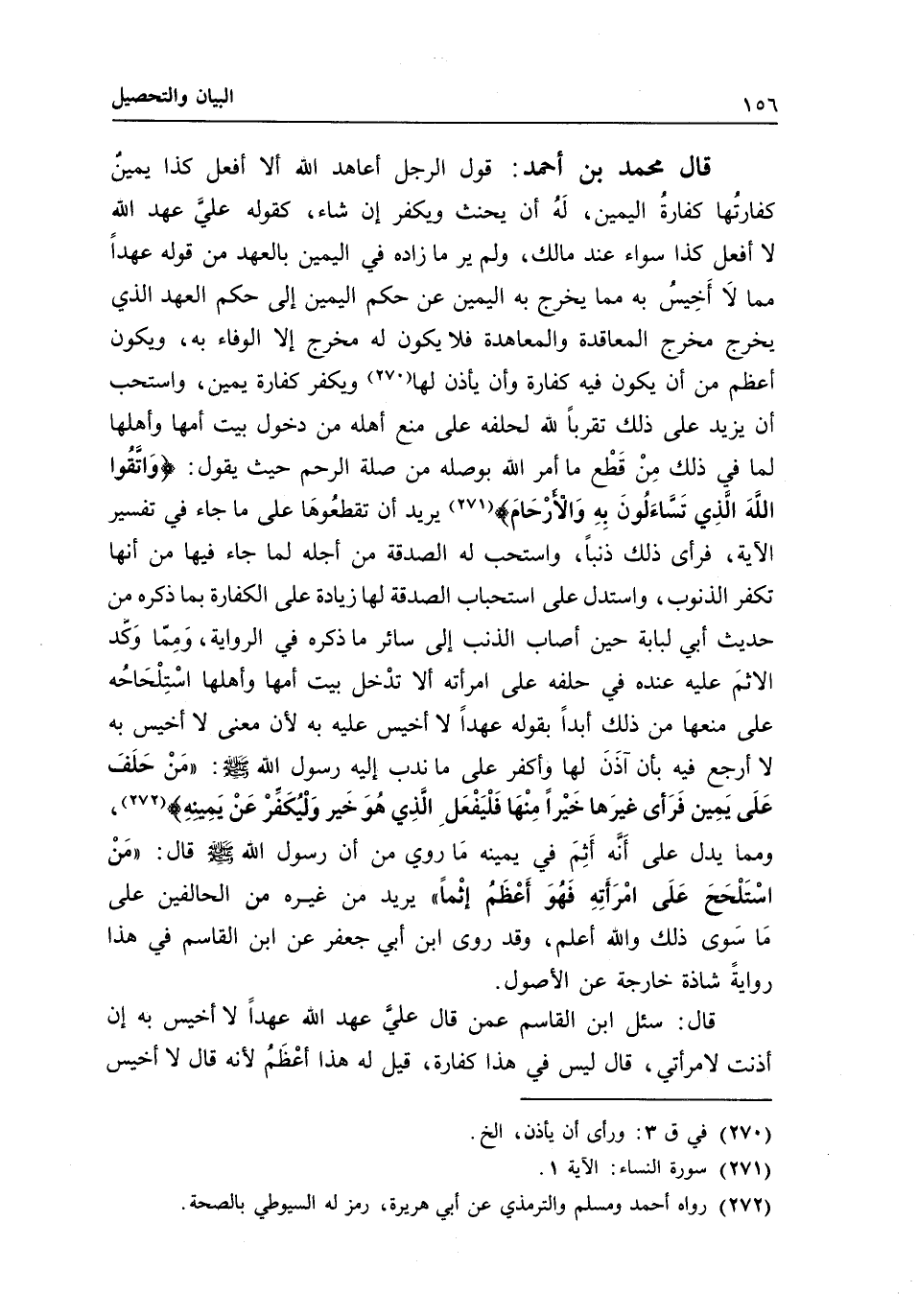 قال محمد بن أحمد: قول الرجل أعاهد الله ألا أفعل كذا يمين كفارتها كفارة اليمين، له أن يحنث ويكفر إن شاء، كقوله: علي عهد الله لا أفعل كذا سواء عند مالك، ولم ير ما زاده في اليمين بالعهد من قوله عهدا مما لا أخيس به مما يخرج به اليمين عن حكم اليمين إلى حكم العهد الذي يخرج مخرج المعاقدة والمعاهدة فلا يكون له مخرج إلا الوفاء به، ويكون أعظم من أن يكون فيه كفارة وأن يأذن لها ويكفر كفارة يمين، واستحب أن يزيد على ذلك تقربا لله لحلفه على منع أهله من دخول بيت أمها وأهلها لما في ذلك من قطع ما أمر الله بوصله من صلة الرحم حيث يقول: {وَاتَّقُوا اللَّهَ الَّذِي تَسَاءَلُونَ بِهِ وَالأَرْحَامَ} [النساء: 1] يريد أن تقطعوها على ما جاء في تفسير الآية، فرأى ذلك ذنبا، واستحب له الصدقة من أجله لما جاء فيها من أنها تكفر الذنوب، واستدل على استحباب الصدقة لها زيادة على الكفارة بما ذكره من حديث أبي لبابة حين أصاب الذنب إلى سائر ما ذكره في الرواية، ومما وكد الإثم عليه عنده في حلفه على امرأته ألا تدخل بيت أمها وأهلها استلحاحه على منعها من ذلك أبدا بقوله عهدا لا أخيس عليه به لأن معنى لا أخيس به لا أرجع فيه بأن آذن لها وأكفر على ما ندب إليه رسول الله - صَلَّى اللَّهُ عَلَيْهِ وَسَلَّمَ -: «من حلف على يمين فرأى غيرها خيرا منها فليفعل الذي هو خير وليكفر عن يمينه» ، ومما يدل على أنه أثم في يمينه ما روي من أن رسول الله - صَلَّى اللَّهُ عَلَيْهِ وَسَلَّمَ - قال: «من استلحح على امرأته فهو أعظم إثما» يريد من غيره من الحالفين على ما سوى ذلك والله أعلم، وقد روى ابن أبي جعفر عن ابن القاسم في هذا رواية شاذة خارجة عن الأصول.