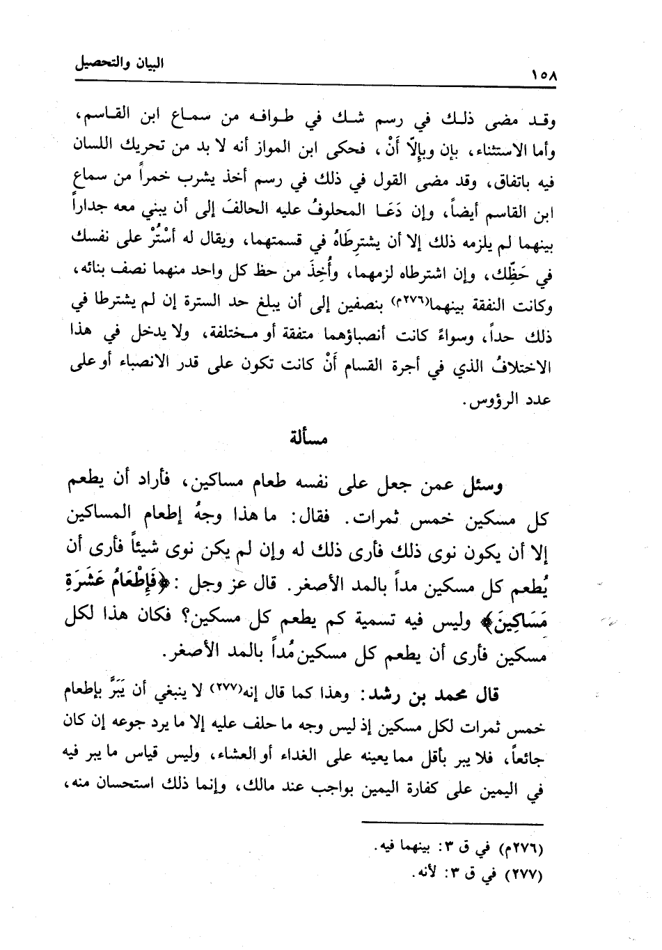 وقد مضى ذلك في رسم شك في طوافه من سماع ابن القاسم، وأما الاستثناء، بإن وبإلا أن، فحكى ابن المواز أنه لا بد من تحريك اللسان فيه باتفاق، وقد مضى القول في ذلك في رسم أخذ يشرب خمرا من سماع ابن القاسم أيضا، وإن دعا المحلوف عليه الحالف إلى أن يبني معه جدارا بينهما لم يلزمه ذلك إلا أن يشترطاه في قسمتهما، ويقال له: استر على نفسك في حظك، وإن اشترطاه لزمهما، وأخذ من حظ كل واحد منهما نصف بنائه، وكانت النفقة بينهما بنصفين إلى أن يبلغ حد السترة إن لم يشترطا في ذلك حدا، وسواء كانت أنصباؤهما متفقة أو مختلفة، ولا يدخل في هذا الاختلاف الذي في أجرة القسام أن كانت تكون على قدر الانصباء أو على عدد الرؤوس.