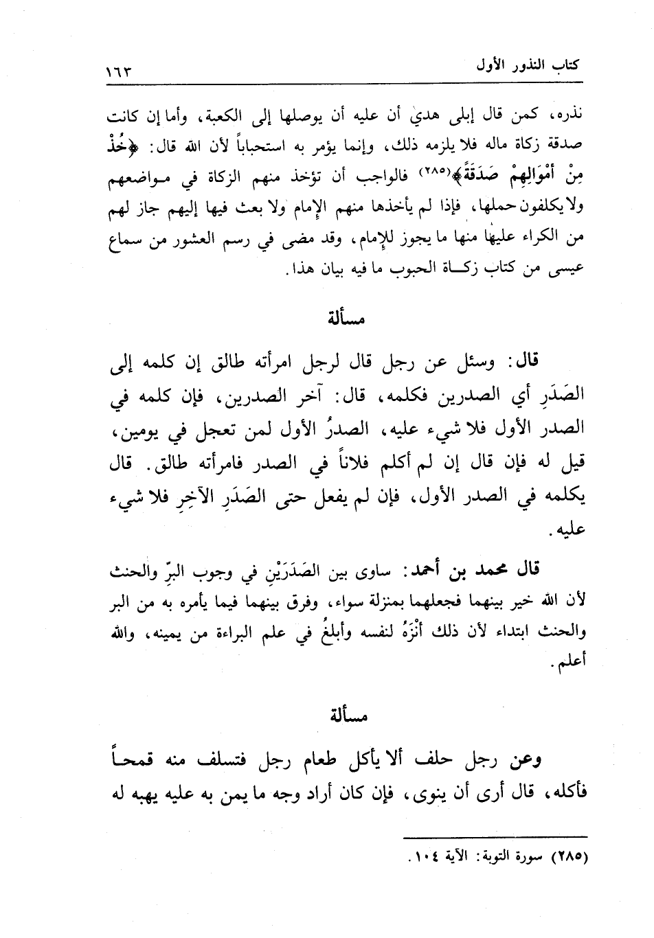مسألة قال: وسئل عن رجل قال لرجل امرأته طالق إن كلمه إلى الصدر أي الصدرين فكلمه، قال: آخر الصدرين، فإن كلمه في الصدر الأول فلا شيء عليه، الصدر الأول لمن تعجل في يومين، قيل له: فإن قال: إن لم أكلم فلانا في الصدر فامرأته طالق. قال: يكلمه في الصدر الأول، فإن لم يفعل حتى الصدر الآخر فلا شيء عليه.