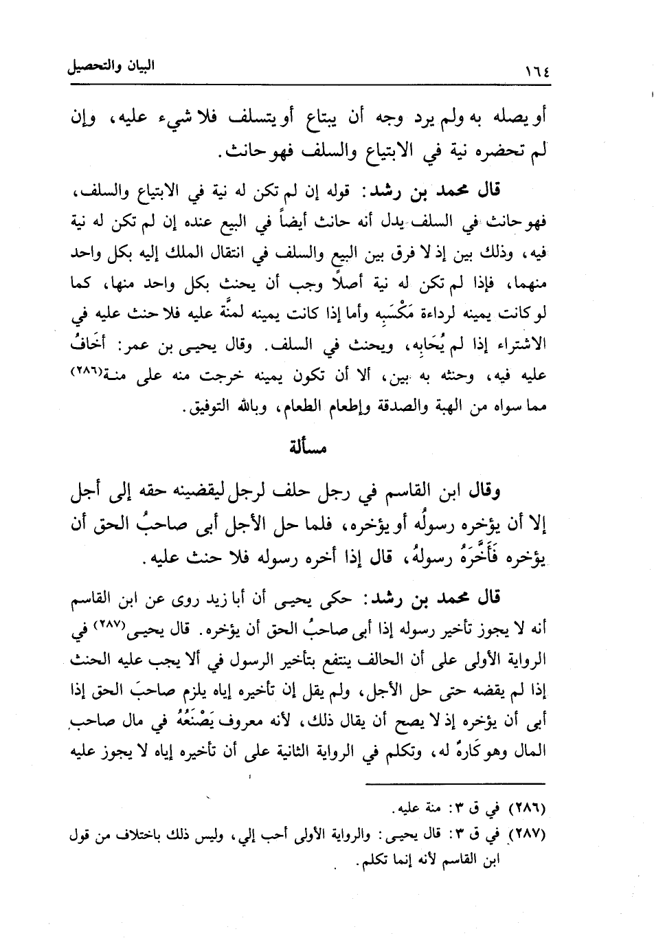 قال محمد بن رشد: حكى يحيى أن أبا زيد روى عن ابن القاسم أنه لا يجوز تأخير رسوله إذا أبى صاحب الحق أن يؤخره. قال يحيى في الرواية الأولى على أن الحالف ينتفع بتأخير الرسول في ألا يجب عليه الحنث إذا لم يقضه حتى حل الأجل، ولم يقل إن تأخيره إياه يلزم صاحب الحق إذا أبى أن يؤخره إذ لا يصح أن يقال ذلك؛ لأنه معروف يصنعه في مال صاحب المال وهو كاره له، وتكلم في الرواية الثانية على أن تأخيره إياه لا يجوز عليه