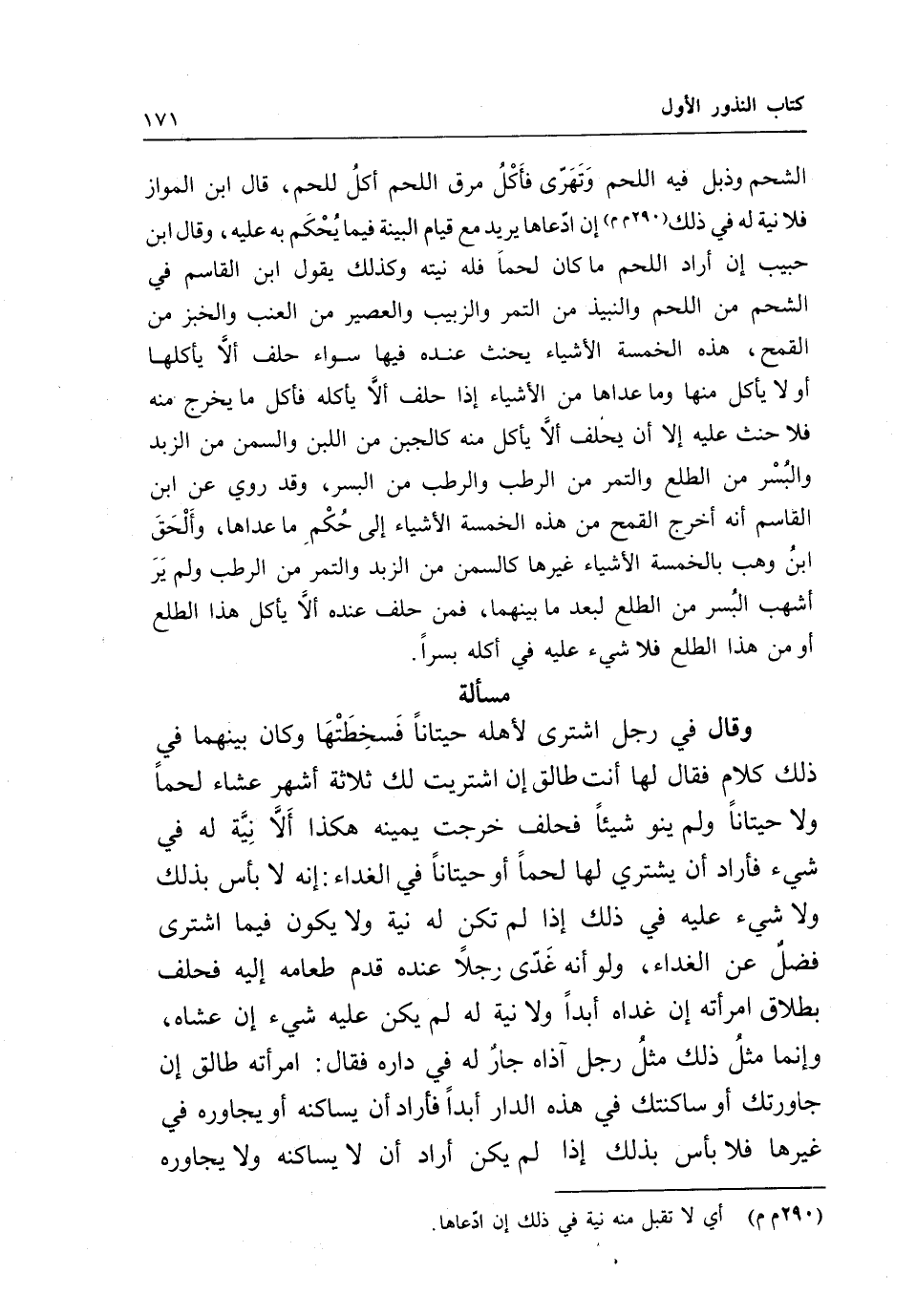 مسألة وقال في رجل اشترى لأهله حيتانا فسخطتها وكان بينهما في ذلك كلام فقال لها: أنت طالق إن اشتريت لك ثلاثة أشهر عشاء لحما ولا حيتانا ولم ينو شيئا فحلف خرجت يمينه هكذا ألا نية له في شيء فأراد أن يشتري لها لحما أو حيتانا في الغداء: إنه لا بأس بذلك ولا شيء عليه في ذلك إذا لم تكن له نية ولا يكون فيما اشترى فضل عن الغداء، ولو أنه غدى رجلا عنده قدم طعامه إليه فحلف بطلاق امرأته إن غداه أبدا ولا نية له لم يكن عليه شيء إن عشاه، وإنما مثل ذلك مثل رجل آذاه جار له في داره فقال: امرأته طالق إن جاورتك أو ساكنتك في هذه الدار أبدا فأراد أن يساكنه أو يجاوره في غيرها فلا بأس بذلك إذا لم يكن أراد أن لا يساكنه ولا يجاوره