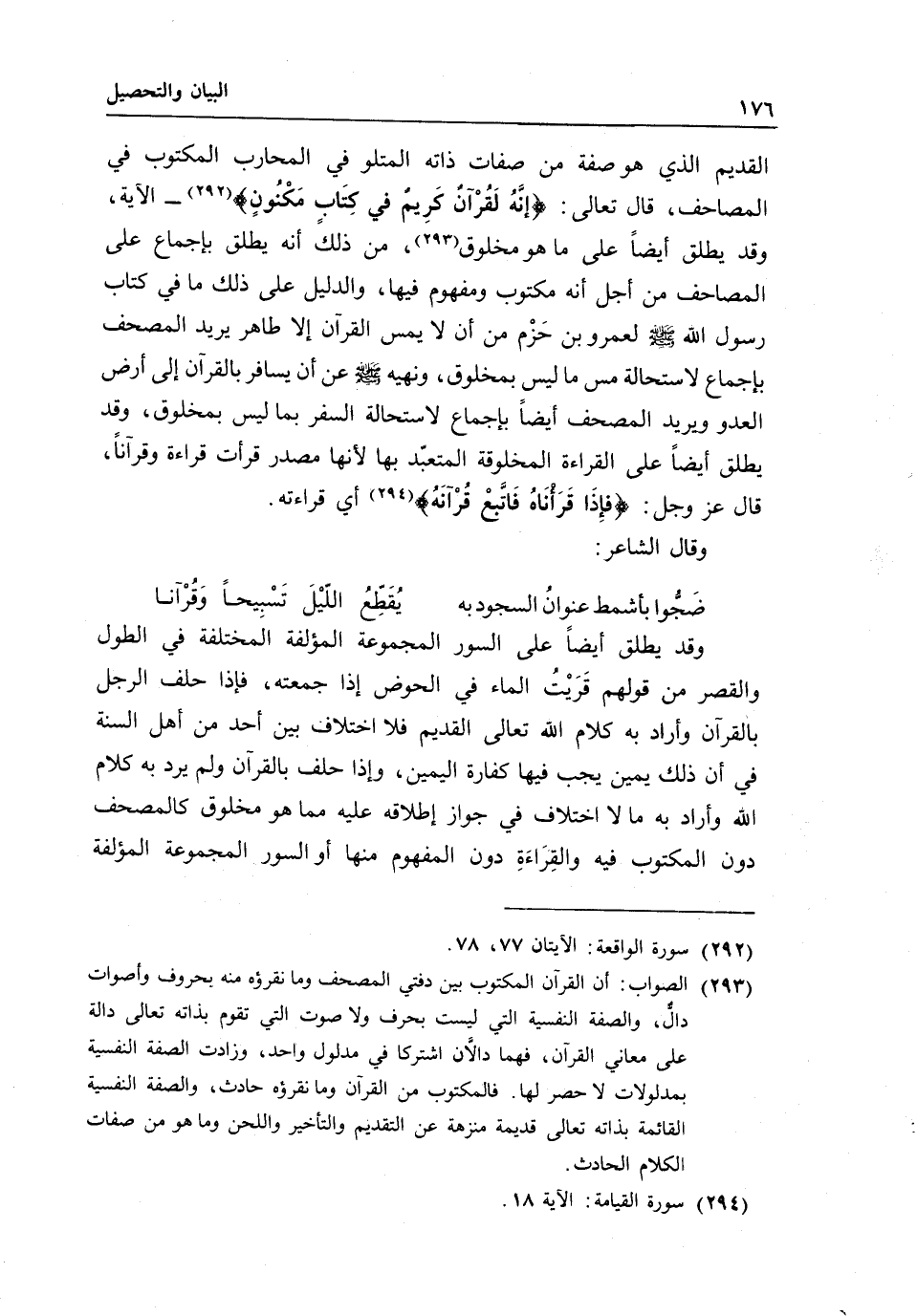 القديم الذي هو صفة من صفات ذاته المتلو في المحارب المكتوب في المصاحف، قال تعالى: {إِنَّهُ لَقُرْآنٌ كَرِيمٌ} [الواقعة: 77] {فِي كِتَابٍ مَكْنُونٍ} [الواقعة: 78]- الآية، وقد يطلق أيضا على ما هو مخلوق، من ذلك أنه يطلق بإجماع على المصاحف من أجل أنه مكتوب ومفهوم فيها، والدليل على ذلك ما في كتاب رسول الله - صَلَّى اللَّهُ عَلَيْهِ وَسَلَّمَ - لعمرو بن حزم من أن «لا يمس القرآن إلا طاهر» يريد المصحف بإجماع لاستحالة مس ما ليس بمخلوق، «ونهيه - صَلَّى اللَّهُ عَلَيْهِ وَسَلَّمَ - عن أن يسافر بالقرآن إلى أرض العدو» ويريد المصحف أيضا بإجماع لاستحالة السفر بما ليس بمخلوق، وقد يطلق أيضا على القراءة المخلوقة المتعبد بها لأنها مصدر قرأت قراءة وقرآنا، قال عز وجل: {فَإِذَا قَرَأْنَاهُ فَاتَّبِعْ قُرْآنَهُ} [القيامة: 18] أي قراءته.