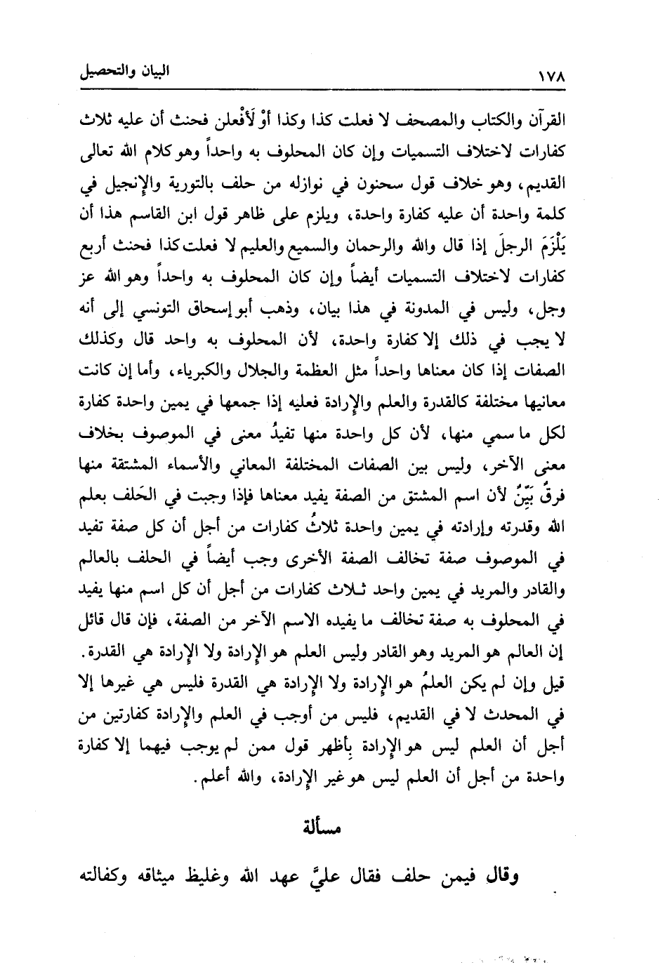 القرآن والكتاب والمصحف لا فعلت كذا وكذا أو لأفعلن فحنث أن عليه ثلاث كفارات لاختلاف التسميات وإن كان المحلوف به واحدا وهو كلام الله تعالى القديم، وهو خلاف قول سحنون في نوازله من حلف بالتوراة والإنجيل في كلمة واحدة أن عليه كفارة واحدة، ويلزم على ظاهر قول ابن القاسم هذا أن يلزم الرجل إذا قال والله والرحمن والسميع والعليم لا فعلت كذا فحنث أربع كفارات لاختلاف التسميات أيضا وإن كان المحلوف به واحدا وهو الله عز وجل، وليس في المدونة في هذا بيان، وذهب أبو إسحاق التونسي إلى أنه لا يجب في ذلك إلا كفارة واحدة؛ لأن المحلوف به واحد قال: وكذلك الصفات إذا كان معناها واحدا مثل العظمة والجلال والكبرياء، وأما إن كانت معانيها مختلفة كالقدرة والعلم والإرادة فعليه إذا جمعها في يمين واحدة كفارة لكل ما سمي منها؛ لأن كل واحدة منها تفيد معنى في الموصوف بخلاف معنى الآخر، وليس بين الصفات المختلفة المعاني والأسماء المشتقة منها فرق بين لأن اسم المشتق من الصفة يفيد معناها فإذا وجبت في الحلف بعلم الله وقدرته وإرادته في يمين واحدة ثلاث كفارات من أجل أن كل صفة تفيد في الموصوف صفة تخالف الصفة الأخرى وجب أيضا في الحلف بالعالم والقادر والمريد في يمين واحد ثلاث كفارات من أجل أن كل اسم منها يفيد في المحلوف به صفة تخالف ما يفيده الاسم الآخر من الصفة، فإن قال قائل: إن العالم هو المريد وهو القادر وليس العلم هو الإرادة ولا الإرادة هي القدرة. قيل: وإن لم يكن العلم هو الإرادة ولا الإرادة هي القدرة فليس هي غيرها إلا في المحدث لا في القديم، فليس من أوجب في العلم والإرادة كفارتين من أجل أن العلم ليس هو الإرادة بأظهر قول ممن لم يوجب فيهما إلا كفارة واحدة من أجل أن العلم ليس هو غير الإرادة، والله أعلم.