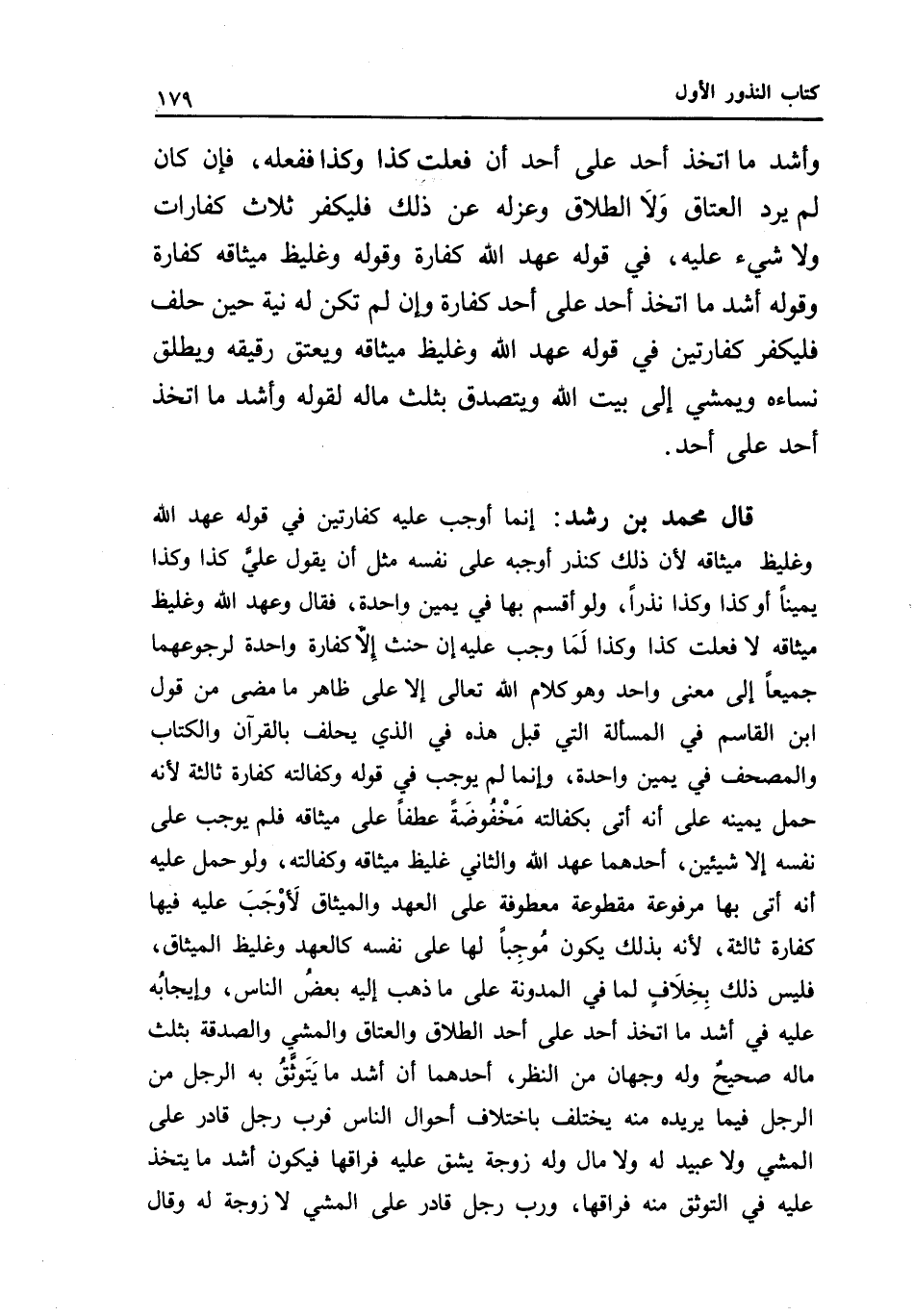 قال محمد بن رشد: إنما أوجب عليه كفارتين في قوله عهد الله وغليظ ميثاقه؛ لأن ذلك كنذر أوجبه على نفسه مثل أن يقول علي كذا وكذا يمينا أو كذا وكذا نذرا، ولو أقسم بها في يمين واحدة، فقال: وعهد الله وغليظ ميثاقه لا فعلت كذا وكذا لما وجب عليه إن حنث إلا كفارة واحدة لرجوعهما جميعا إلى معنى واحد وهو كلام الله تعالى إلا على ظاهر ما مضى من قول ابن القاسم في المسألة التي قبل هذه في الذي يحلف بالقرآن والكتاب والمصحف في يمين واحدة، وإنما لم يوجب في قوله وكفالته كفارة ثالثة؛ لأنه حمل يمينه على أنه أتى بكفالته مخفوضة عطفا على ميثاقه فلم يوجب على نفسه إلا شيئين، أحدهما عهد الله والثاني غليظ ميثاقه وكفالته، ولو حمل عليه أنه أتى بها مرفوعة مقطوعة معطوفة على العهد والميثاق لأوجب عليه فيها كفارة ثالثة؛ لأنه بذلك يكون موجبا لها على نفسه كالعهد وغليظ الميثاق، فليس ذلك بخلاف لما في المدونة على ما ذهب إليه بعض الناس، وإيجابه عليه في أشد ما اتخذ أحد على أحد الطلاق والعتاق والمشي والصدقة بثلث ماله صحيح وله وجهان من النظر، أحدهما أن أشد ما يتوثق به الرجل من الرجل فيما يريده منه يختلف باختلاف أحوال الناس فرب رجل قادر على المشي ولا عبيد له ولا مال وله زوجة يشق عليه فراقها فيكون أشد ما يتخذ عليه في التوثق منه فراقها، ورب رجل قادر على المشي لا زوجة له وقال