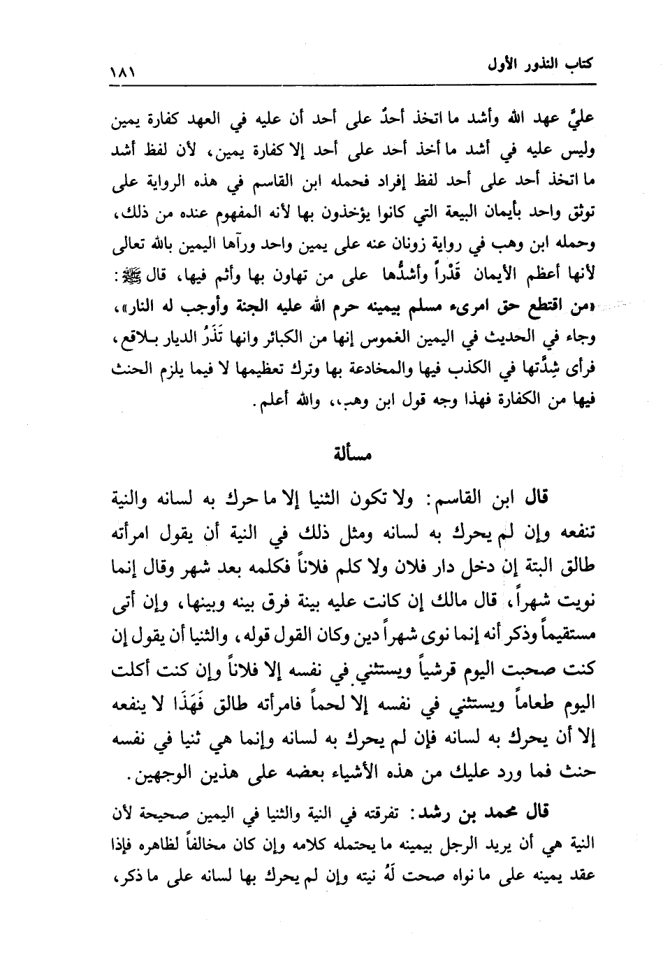 قال محمد بن رشد: تفرقته في النية والثنيا في اليمين صحيحة لأن النية هي أن يريد الرجل بيمينه ما يحتمله كلامه وإن كان مخالفا لظاهره فإذا عقد يمينه على ما نواه صحت له نيته وإن لم يحرك بها لسانه على ما ذكر،