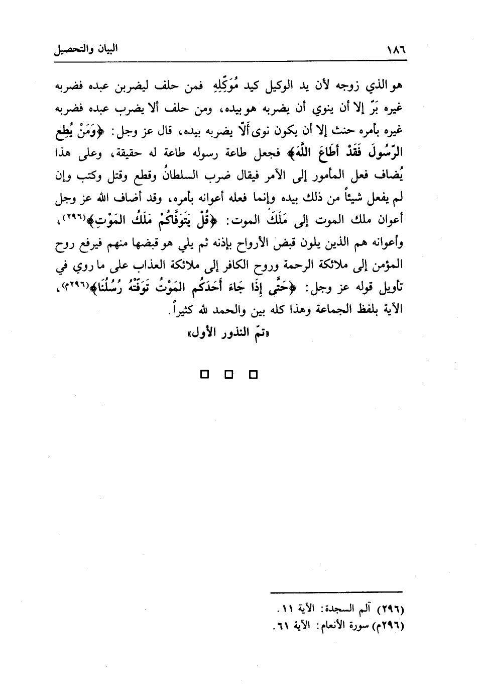 هو الذي زوجه لأن يد الوكيل كيد موكله فمن حلف ليضربن عبده فضربه غيره بر إلا أن ينوي أن يضربه هو بيده، ومن حلف ألا يضرب عبده فضربه غيره بأمره حنث إلا أن يكون نوى ألا يضربه بيده، قال عز وجل: {مَنْ يُطِعِ الرَّسُولَ فَقَدْ أَطَاعَ اللَّهَ} [النساء: 80] فجعل طاعة رسوله طاعة له حقيقة، وعلى هذا يضاف فعل المأمور إلى الآمر فيقال ضرب السلطان وقطع وقتل وكتب وإن لم يفعل شيئا من ذلك بيده وإنما فعله أعوانه بأمره، وقد أضاف الله عز وجل أعوان ملك الموت إلى ملك الموت: {قُلْ يَتَوَفَّاكُمْ مَلَكُ الْمَوْتِ} [السجدة: 11] ، وأعوانه هم الذين يلون قبض الأرواح بإذنه ثم يلي هو قبضها منهم فيرفع روح المؤمن إلى ملائكة الرحمة وروح الكافر إلى ملائكة العذاب على ما روي في تأويل قوله عز وجل: {حَتَّى إِذَا جَاءَ أَحَدَكُمُ الْمَوْتُ تَوَفَّتْهُ رُسُلُنَا} [الأنعام: 61] ، الآية بلفظ الجماعة وهذا كله بين والحمد لله كثيرا.