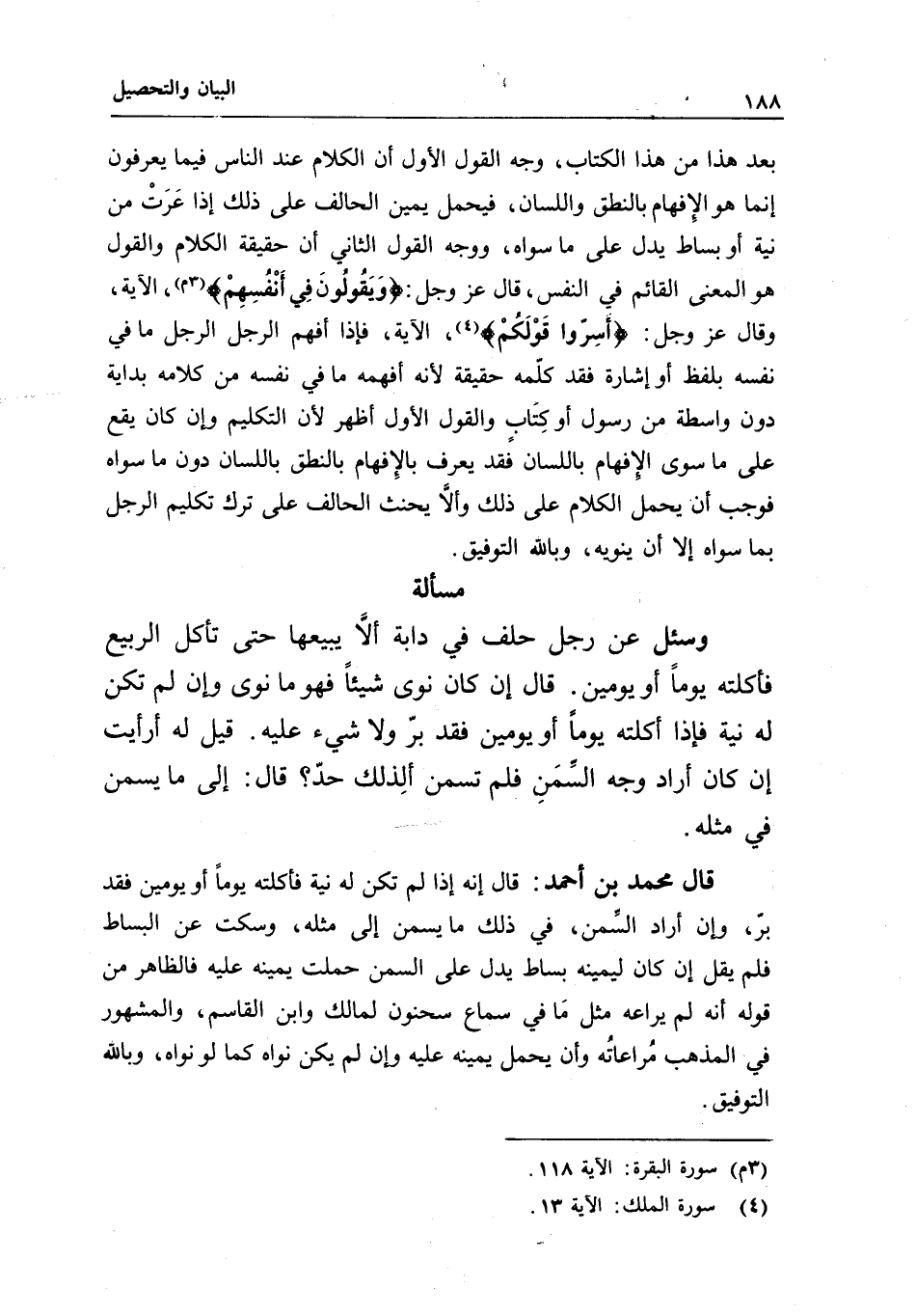 بعد هذا من هذا الكتاب، وجه القول الأول أن الكلام عند الناس فيما يعرفون إنما هو الإفهام بالنطق واللسان، فيحمل يمين الحالف على ذلك إذا عرت من نية أو بساط يدل على ما سواه، ووجه القول الثاني أن حقيقة الكلام والقول هو المعنى القائم في النفس، قال عز وجل: {وَيَقُولُونَ فِي أَنْفُسِهِمْ} [المجادلة: 8] ، الآية، وقال عز وجل: {وَأَسِرُّوا قَوْلَكُمْ} [الملك: 13] ، الآية، فإذا أفهم الرجل الرجل ما في نفسه بلفظ أو إشارة فقد كلمه حقيقة لأنه أفهمه ما في نفسه من كلامه بداية دون واسطة من رسول أو كتاب والقول الأول أظهر لأن التكليم وإن كان يقع على ما سوى الإفهام باللسان فقد يعرف بالإفهام بالنطق باللسان دون ما سواه فوجب أن يحمل الكلام على ذلك وألا يحنث الحالف على ترك تكليم الرجل بما سواه إلا أن ينويه، وبالله التوفيق.