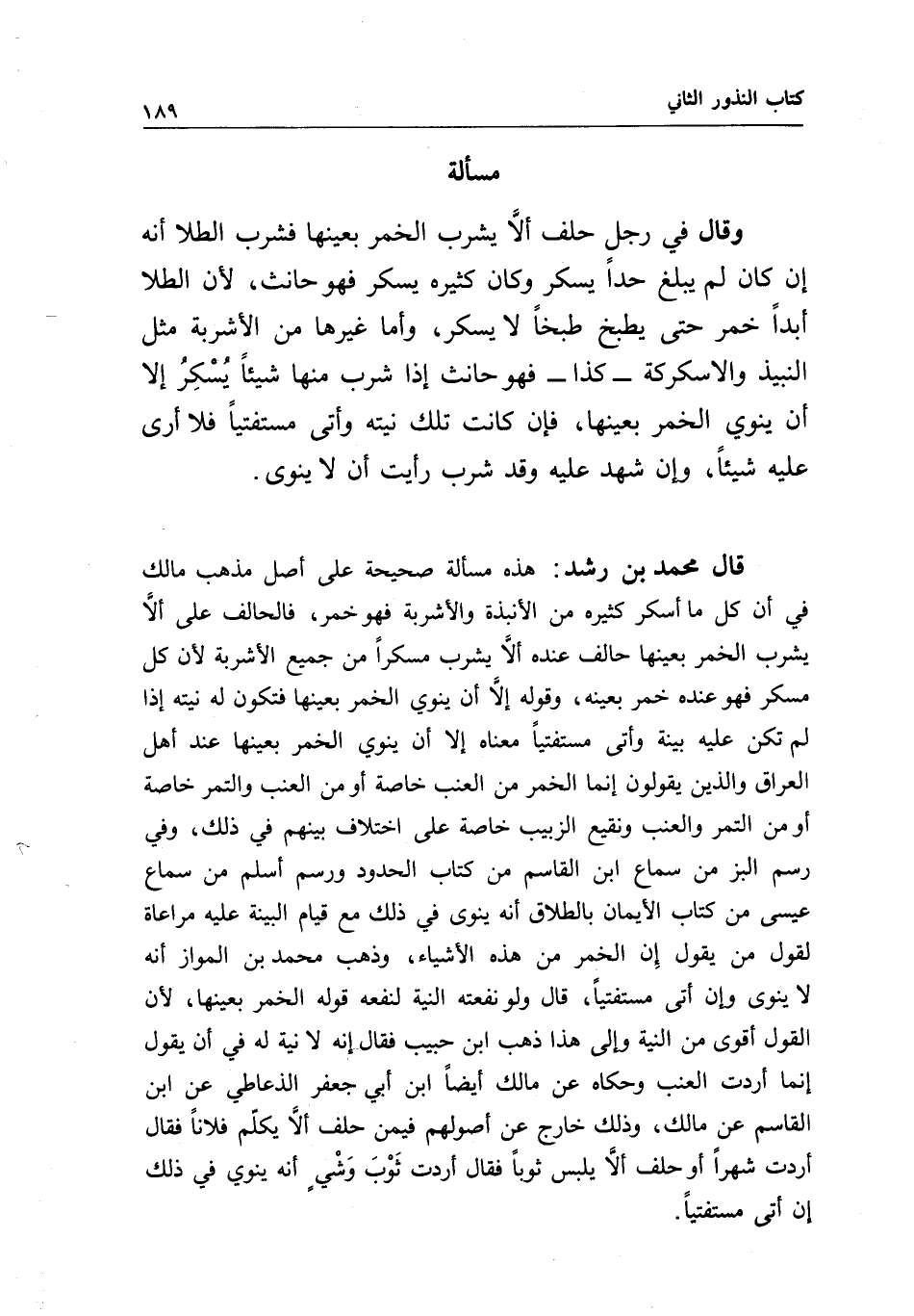 قال محمد بن رشد: هذه مسألة صحيحة على أصل مذهب مالك في أن كل ما أسكر كثيره من الأنبذة والأشربة فهو خمر، فالحالف على ألا يشرب الخمر بعينها حالف عنده ألا يشرب مسكرا من جميع الأشربة لأن كل مسكر فهو عنده خمر بعينه، وقوله: إلا أن ينوي الخمر بعينها فتكون له نيته إذا لم تكن عليه بينة وأتى مستفتيا معناه إلا أن ينوي الخمر بعينها عند أهل العراق والذين يقولون: إنما الخمر من العنب خاصة أو من العنب والتمر خاصة أو من التمر والعنب ونقيع الزبيب خاصة على اختلاف بينهم في ذلك، وفي رسم البز من سماع ابن القاسم من كتاب الحدود ورسم أسلم من سماع عيسى من كتاب الأيمان بالطلاق أنه ينوى في ذلك مع قيام البينة عليه مراعاة لقول من يقول إن الخمر من هذه الأشياء، وذهب محمد بن المواز أنه لا ينوى وإن أتى مستفتيا، قال: ولو نفعته النية لنفعه قوله الخمر بعينها؛ لأن القول أقوى من النية وإلى هذا ذهب ابن حبيب فقال: إنه لا نية له في أن يقول إنما أردت العنب وحكاه عن مالك أيضا ابن أبي جعفر الذعاطي عن ابن القاسم عن مالك، وذلك خارج عن أصولهم فيمن حلف ألا يكلم فلانا فقال: أردت شهرا أو حلف ألا يلبس ثوبا فقال: أردت ثوب وشي أنه ينوى في ذلك إن أتى مستفتيا.