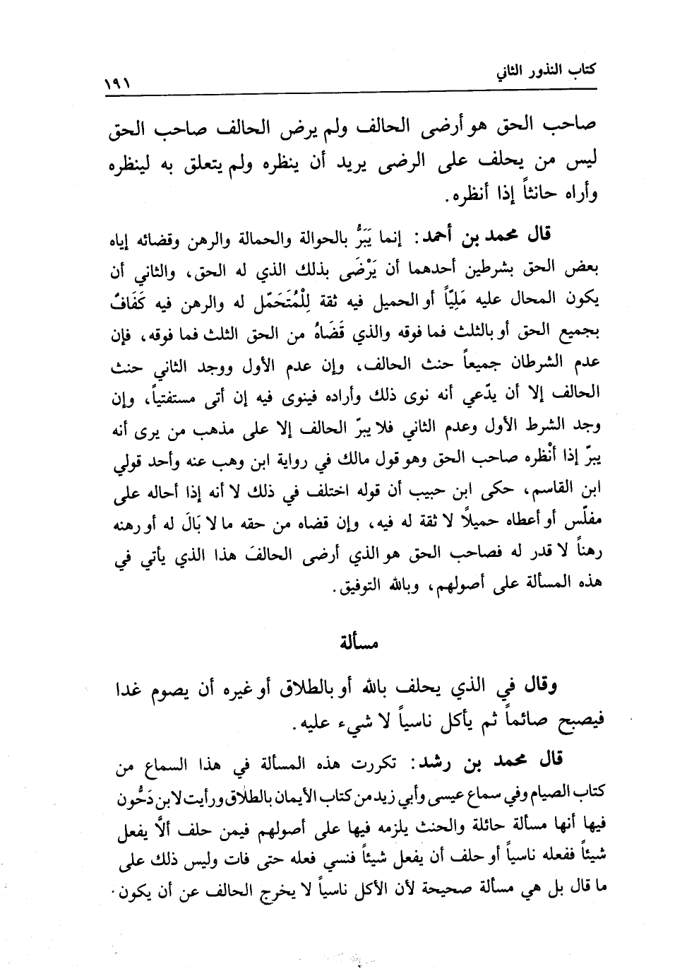 قال محمد بن رشد: تكررت هذه المسألة في هذا السماع من كتاب الصيام وفي سماع عيسى وأبي زيد من كتاب الأيمان بالطلاق ورأيت لابن دحون فيها أنها مسألة حائلة والحنث يلزمه فيها على أصولهم فيمن حلف ألا يفعل شيئا ففعله ناسيا أو حلف أن يفعل شيئا فنسي فعله حتى فات وليس ذلك على ما قال بل هي مسألة صحيحة لأن الأكل ناسيا لا يخرج الحالف عن أن يكون