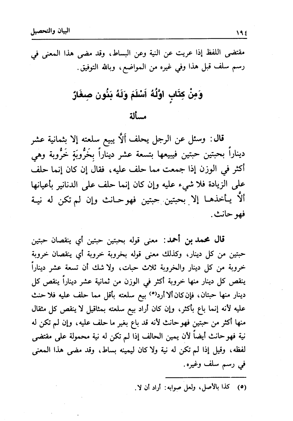 مسألة قال: وسئل عن الرجل يحلف ألا يبيع سلعته إلا بثمانية عشر دينارا بحبتين حبتين فيبيعها بتسعة عشر دينارا بخروبة خروبة وهي أكثر في الوزن إذا جمعت مما حلف عليه، فقال: إن كان إنما حلف على الزيادة فلا شيء عليه وإن كان إنما حلف على الدنانير بأعيانها ألا يأخذها إلا بحبتين حبتين فهو حانث وإن لم تكن له نية فهو حانث.