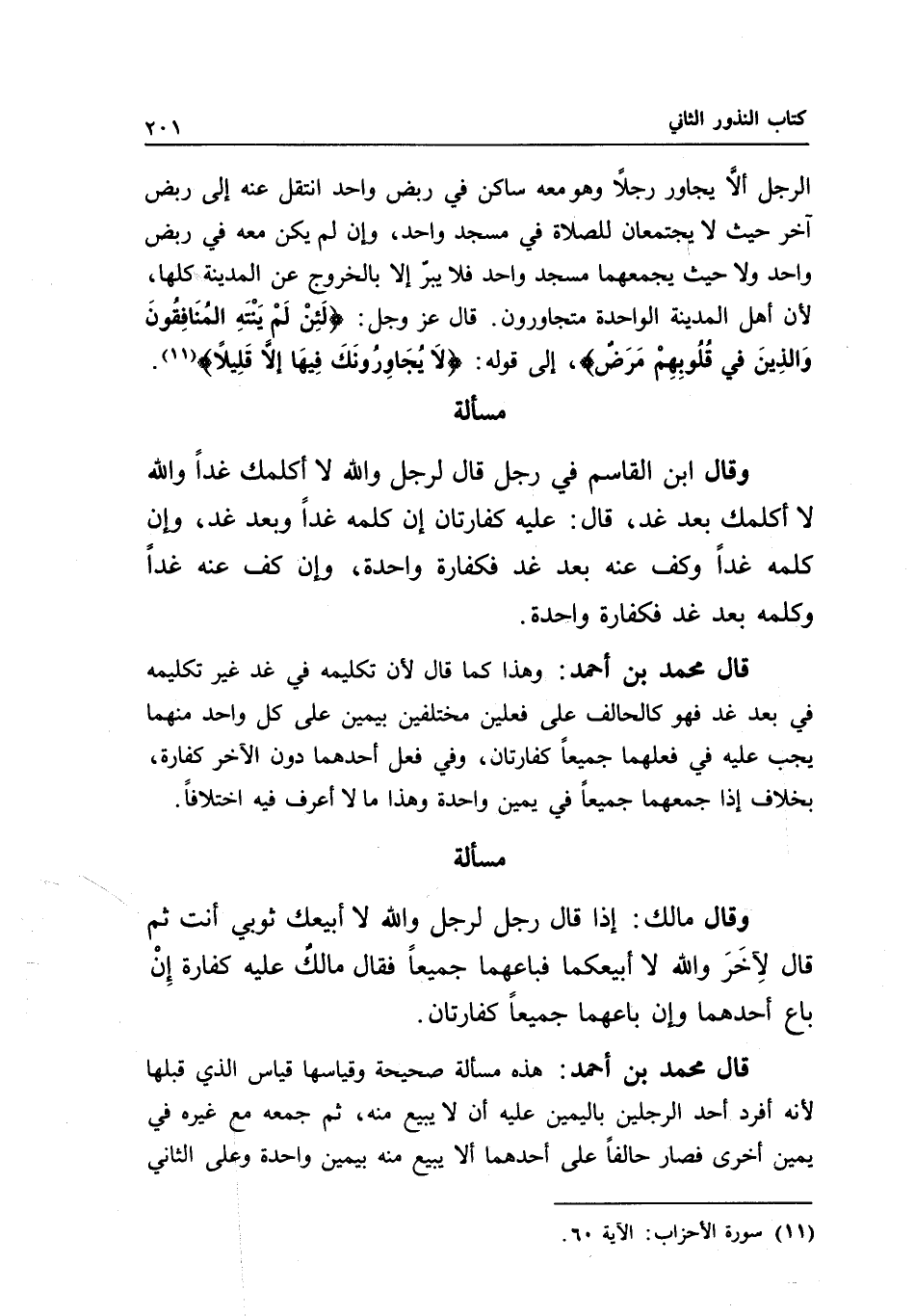 الرجل ألا يجاور رجلا وهو معه ساكن في ربض واحد انتقل عنه إلى ربض آخر حيث لا يجتمعان للصلاة في مسجد واحد، وإن لم يكن معه في ربض واحد ولا حيث يجمعهما مسجد واحد فلا يبر إلا بالخروج عن المدينة كلها؛ لأن أهل المدينة الواحدة متجاورون. قال عز وجل: {لَئِنْ لَمْ يَنْتَهِ الْمُنَافِقُونَ وَالَّذِينَ فِي قُلُوبِهِمْ مَرَضٌ} [الأحزاب: 60] ، إلى قوله: {لا يُجَاوِرُونَكَ فِيهَا إِلا قَلِيلا} [الأحزاب: 60] .