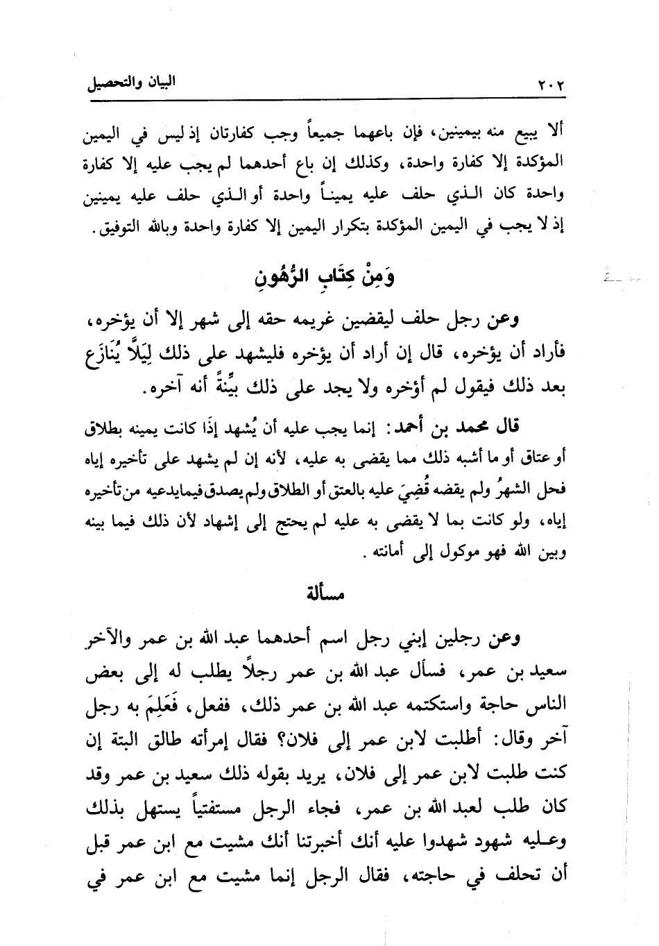مسألة وعن رجلين ابني رجل اسم أحدهما عبد الله بن عمر والآخر سعيد بن عمر، فسأل عبد الله بن عمر رجلا يطلب له إلى بعض الناس حاجة واستكتمه عبد الله بن عمر ذلك ففعل، فعلم به رجل آخر وقال: أطلبت لابن عمر إلى فلان؟ فقال: امرأته طالق البتة إن كنت طلبت لابن عمر إلى فلان، يريد بقوله ذلك سعيد بن عمر وقد كان طلب لعبد الله بن عمر، فجاء الرجل مستفتيا يستهل بذلك وعليه شهود شهدوا عليه أنك أخبرتنا أنك مشيت مع ابن عمر قبل أن تحلف في حاجته، فقال الرجل: إنما مشيت مع ابن عمر في