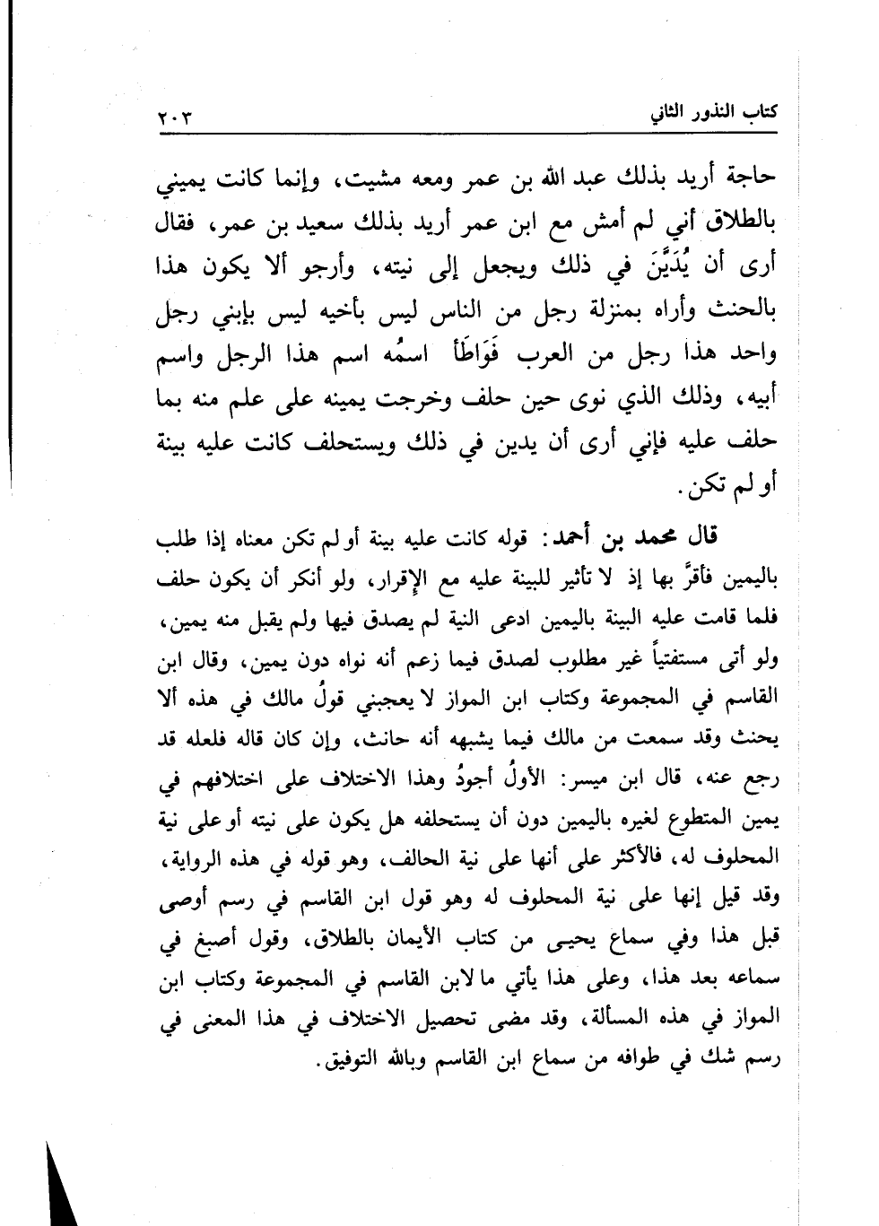 حاجة أريد بذلك عبد الله بن عمر ومعه مشيت، وإنما كانت يميني بالطلاق أني لم أمش مع ابن عمر أريد بذلك سعيد بن عمر، فقال أرى أن يدين في ذلك ويجعل إلى نيته، وأرجو ألا يكون هذا بالحنث وأراه بمنزلة رجل من الناس ليس بأخيه ليس بابني رجل واحد هذا رجل من العرب فواطأ اسمه اسم هذا الرجل واسم أبيه، وذلك الذي نوى حين حلف وخرجت يمينه على علم منه بما حلف عليه فإني أرى أن يدين في ذلك ويستحلف كانت عليه بينة أو لم تكن.